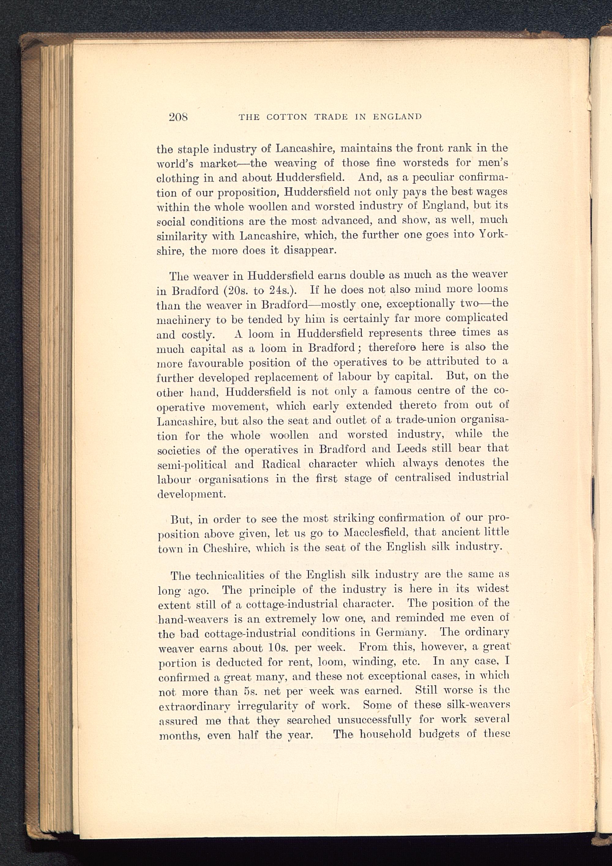 the staple industry of Lancashire , maintains the front rank in theworld’s market—the weaving of those fine worsteds for men’sclothing in and about Huddersfield . And, as a peculiar confirma-tion of our proposition, Huddersfield not only pays the best wageswithin the whole woollen and worsted industry of England , but itssocial conditions are the most advanced, and show, as well, muchsimilarity with Lancashire, which, the further one goes into York-shire , the more does it disappear.