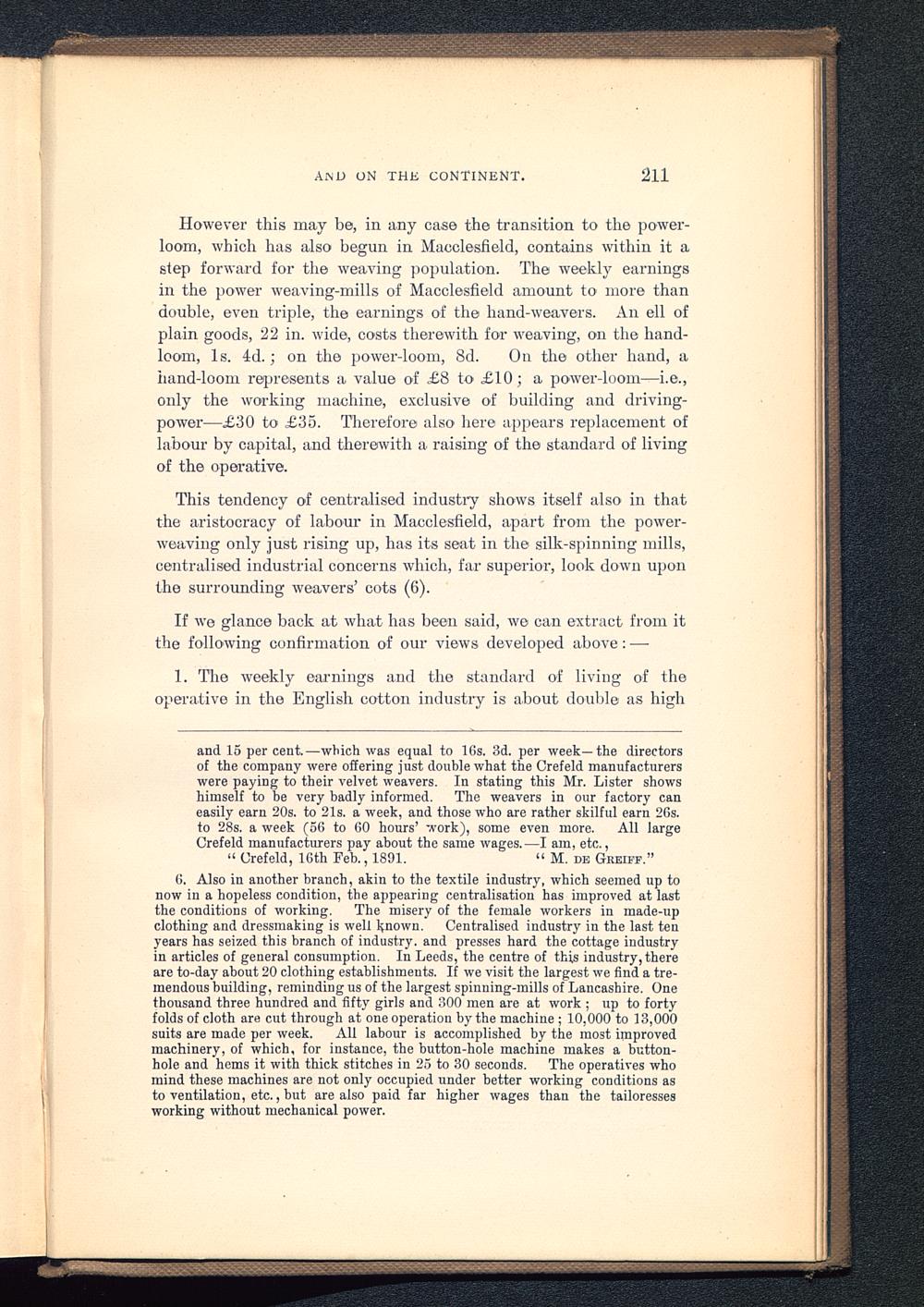 and 15 per cent.—which was equal to lGs. 3d. per week—the directorsof the company were offering just double what the Crefeld manufacturerswere paying to their velvet weavers. In stating this Mr. Lister showshimself to be very badly informed. The weavers in our factory caneasily earn 20s. to 21s. a week, and those who are rather skilful earn 26s.to 28s. a week (56 to 60 hours’ work), some even more. All largeCrefeld manufacturers pay about the same wages.—I am, etc.,