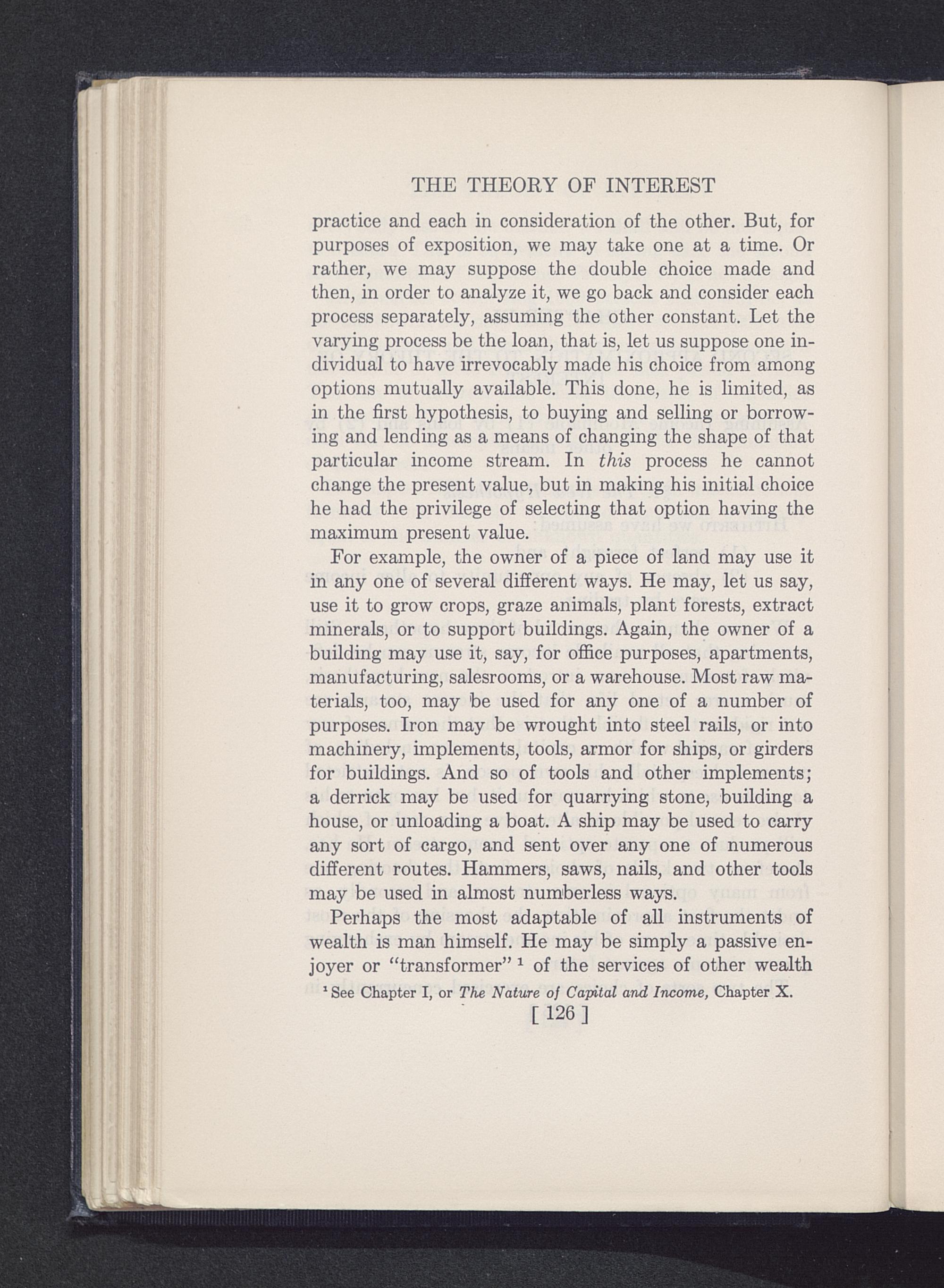 Perhaps the most adaptable of all instruments ofwealth is man himself. He may be simply a passive en-joyer or “transformer” 1 of the services of other wealth1 See Chapter I, or The Nature of Capital and Income, Chapter X.