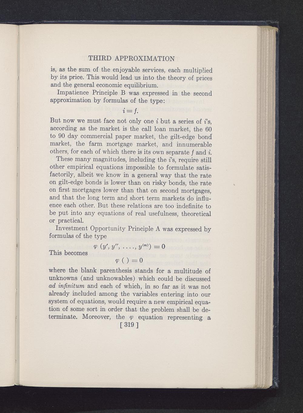 These many magnitudes, including the i’s, require stillother empirical equations impossible to formulate satis-factorily, albeit we know in a general way that the rateon gilt-edge bonds is lower than on risky bonds, the rateon first mortgages lower than that on second mortgages,and that the long term and short term markets do influ-ence each other. But these relations are too indefinite tobe put into any equations of real usefulness, theoreticalor practical.