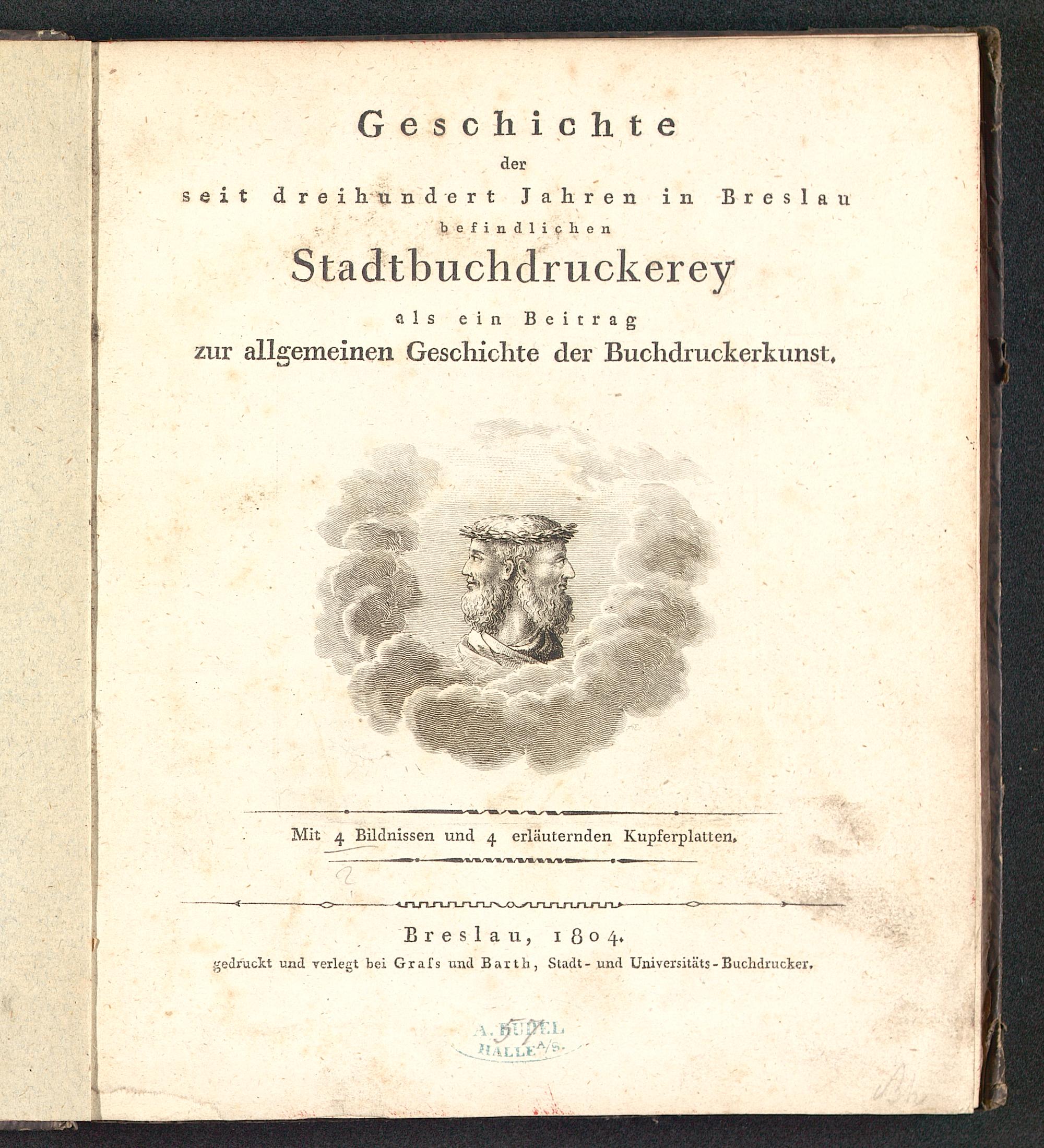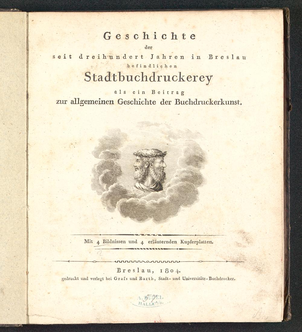 Geschichte der seit dreihundert Jahren in Breslau befindlichen Stadtbuchdruckerey als ein Beitrag zur allgemeinen Geschichte der Buchdruckerkunst : Mit 4 Bildnissen und 4 erläuternden Kupferplatten / [Johann August Barth ; Hr. Geiser ; Hr. Paritius. Johann Ephraim Scheibel [Vorr.]]