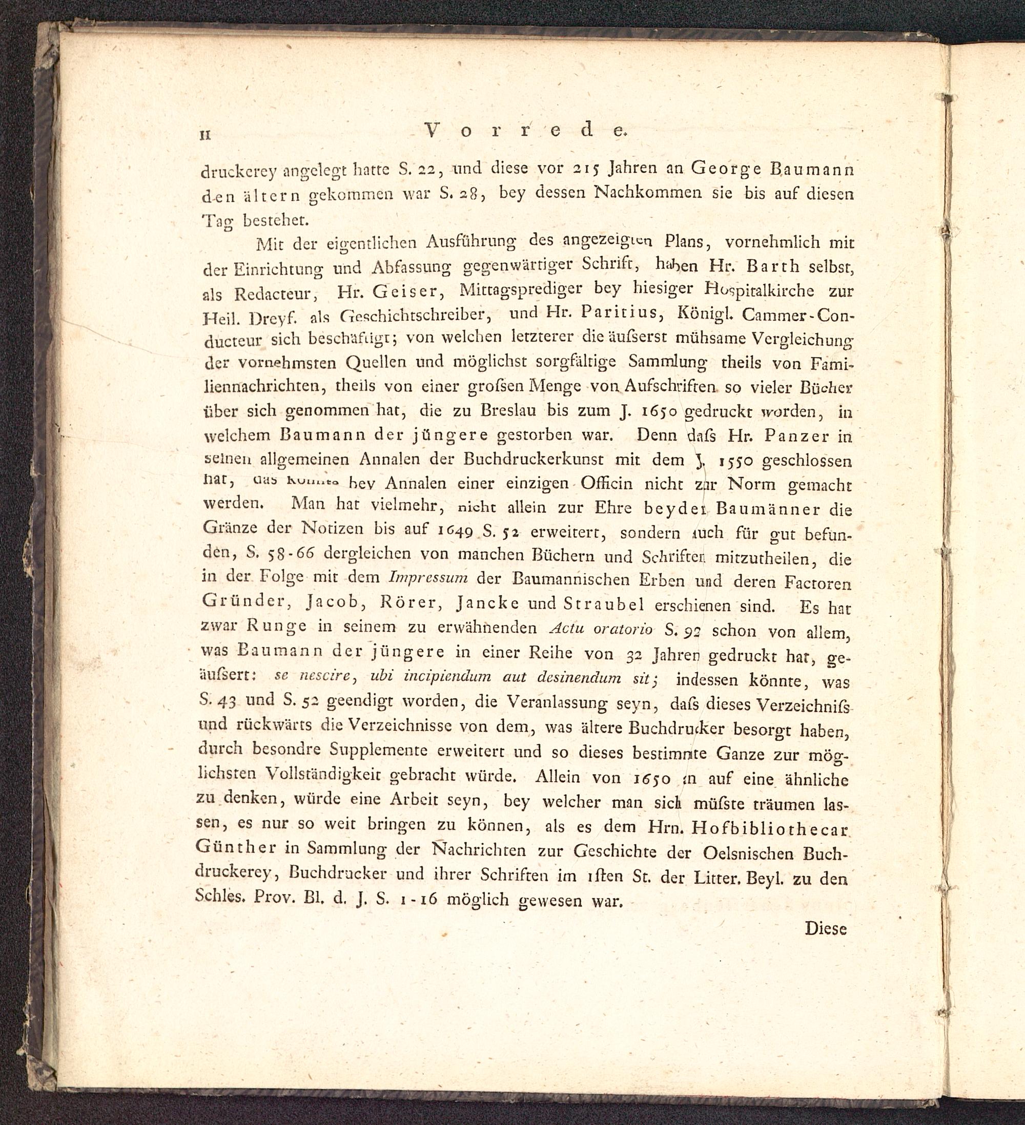 Mit der eigentlichen Ausführung des angezeigten Plans, vornehmlich mitder Einrichtung und Abfassung gegenwärtiger Schrift, haben Hr. Barth selbst,als Redacteur Γ Hr. Geiser, Mittagsprediger bey hiesiger Hospitalkirche zurHeil. Dreyf. als Geschichtschreiber, und Hr. Paritius, König!. Cammer-Con-ducteur sich beschäftigt; von welchen letzterer die äusserst mühsame Vergleich ungder vornehmsten Quellen und möglichst sorgfältige Sammlung theils von Fami-liennachrichten, theils von einer grossen Menge von Aufschriften so vieler Bücherüber sich genommen hat, die zu Breslau bis zum J. 1650 gedruckt worden, inwelchem Baumann der jüngere gestorben war. Denn dass Hr. Panzer inseinen allgemeinen Annalen der Buchdruckerkunst mit dem 3 1550 ־ geschlossenüat, aas Kun״ ta h ev Annalen einer einzigen Officin nicht zur Norm gemachtwerden. Man hat vielmehr, nicht allein zur Ehre beyder Baumänner dieGränze der Notizen bis auf 1C49 S. 52 erweitert, sondern nach für gut befun-den, S. 58-66 dergleichen von manchen Büchern und Schriften mitzutheilen, diein der Folge mit dem Impressum der Baumannischen Erben und deren FactorenGründer, Jacob, Rörer, Jancke und Straubel erschienen sind. Es hatzwar Runge in seinem zu erwähnenden Actu oratorio S. $2 schon von allem,was Β au man η der jüngere in einer Reihe von 32 Jahren gedruckt hat, ge-aussen: se nescire, ubi incipicndiim aut desinendum sit; indessen könnte, wasS. 43 und S. 52 geendigt worden, die Veranlassung seyn, dass dieses Verzeichnissund rückwärts die Verzeichnisse von dem, was ältere Buchdrucker besorgt haben,durch besondre Supplemente erweitert und so dieses bestimmte Ganze zur möp•-liebsten Vollständigkeit gebracht würde. Allein von 1650 β auf eine, ähnlichezu. denken, würde eine Arbeit seyn, bey welcher man siel müsste träumen las-sen, es nur so weit bringen zu können, als es dem Hrn. HofbibliothecarGünther in Sammlung der Nachrichten zur Geschichte der Oelsnischen Buch-druckerey, ßuehdrucker und ihrer Schriften im islen St. der Litter. Beyl. zu denSchles. Prov. Bl. d. J. S. 1 -16 möglich gewesen war.