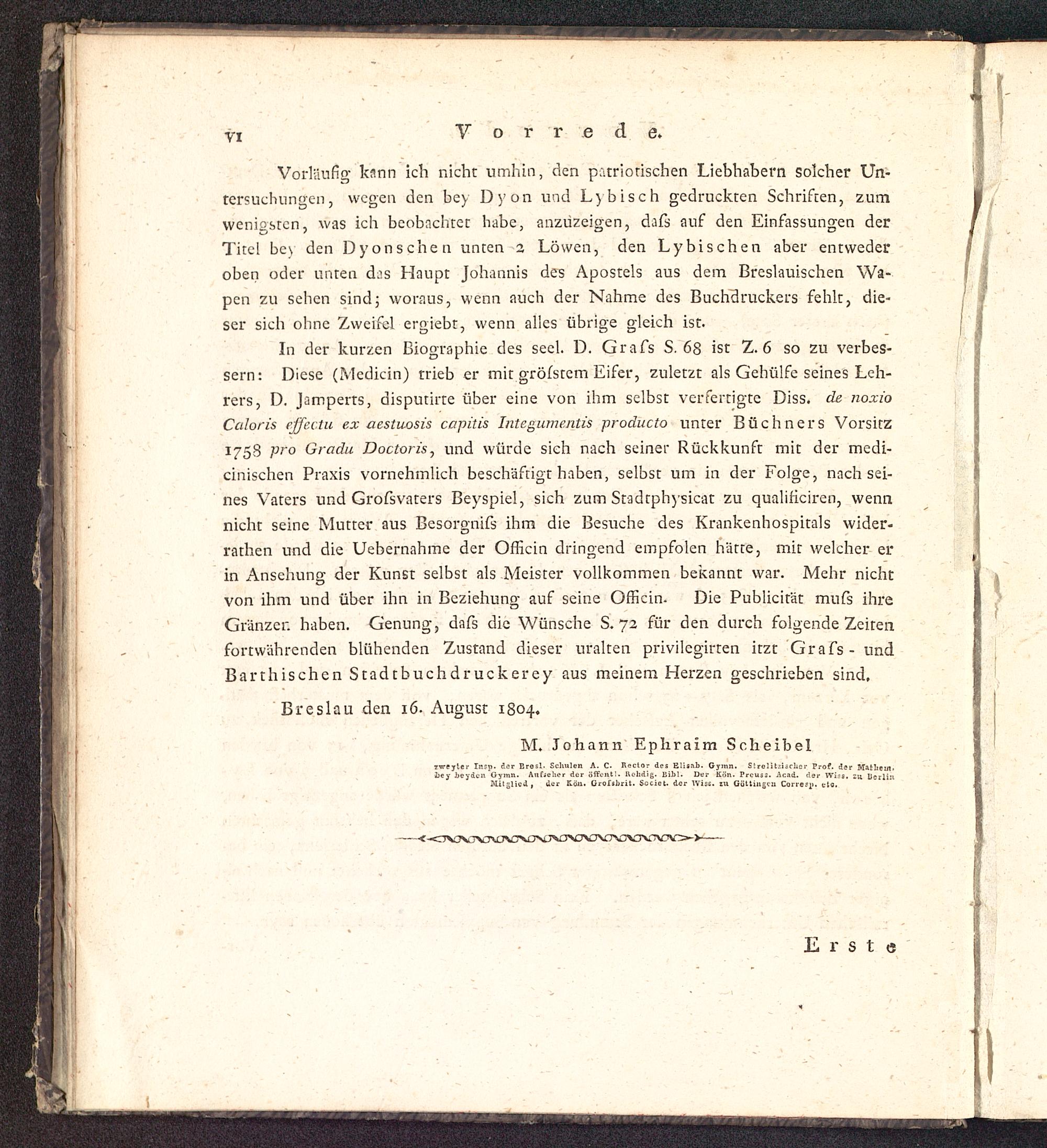 Vorläufig kaiìti ich nicht umhin, den patriotischen Liebhabern solcher Un-tersuchungen , wegen den bey Dyon und L) bisch gedruckten Schriften, zumwenigsten, was ich beobachtet habe, anzuzeigen, dass auf den Einfassungen derTitel be\ den Dyon s che η unten 2 Löwen, den L y bischen aber entwederoben oder unten d^s Haupt Johannis des Apostels aus dem Breslauischen Wa־pen zu sehen sind; woraus, wenn auch der Nahme des Buchdruckers fehlt, die-ser sich ohne Zweifel ergiebt, wenn alles übrige gleich ist.