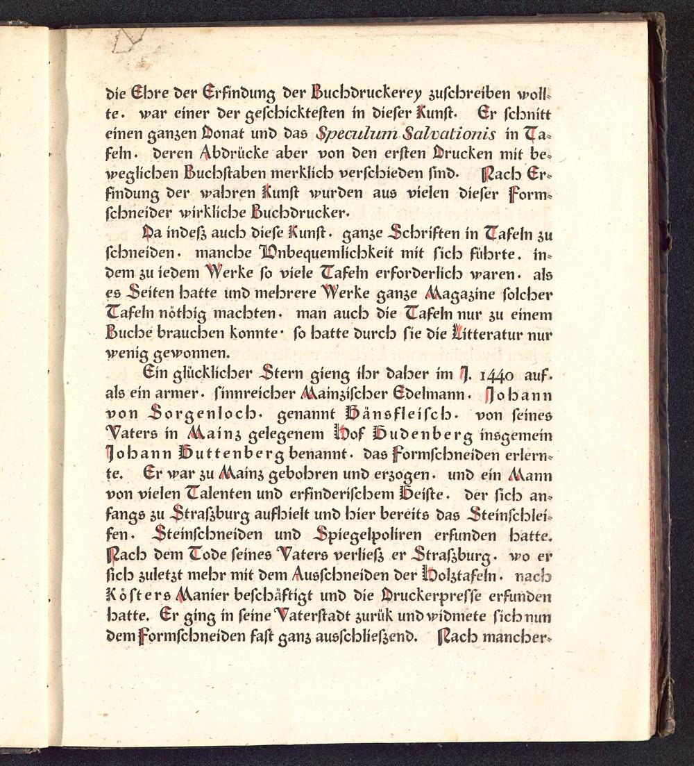 Cin glücklicker Ltern gieng ikr daker im % 1440 auf.als ein armer . sinnreicker àainziscker Edelmann . 0 ל h an ווvon Lorgenlock, genannt Dansfleisck- von seines*Vaters in Mainz gelegenem Ibof Dudenberg insgemein"Jokann Duttenberg benannt, das jf^ormscbneiden erle^te. Er war zu Mainz gebohren und erzogen . und ein Mannvon vielen Talenten und erfinderischem Deiste . der sich an*fangs zu Ltraszburg aufspielt und hier bereits das Lteinschlei*fen. Lteinschneiden und Lpiegelpoliren erfunden katte.(2acb dem Code seines *Vaters verliesz er Ltraszburg . wo er(Ick zuletzt mekr mit dem Ausschneiden der ÜDolztafeln . nachΚ öfters Manier beschäftigt und die Hruckerpresse erfundenKatte. Er ging in seine *Vaterstadt zurük und^ridmete sick nundem j^ormsckneiden fast ganz ausscklieszend. f2acb mancber*