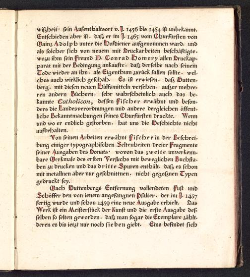 KHKvK sein Aufenthaltsort x>.% 1456 bis 1464 ist unbekannt.Entschieden aber ist . dasz er im !J. 1465 vom OhurDrsten vonMainz Adolph unter die ÜDofdiener aufgenommen ward, undals solcher sick von neuem mit ÖrucKarbeiten beschäftigte,irozu ibm sein freund D. G on rat) bomery allen siruckap»parat mit der Bedingung ankaufte . dasz derselbe nach seinemCot>e nieder an ihn . als Eigenthum zurück fallen sollte . wehches auch wirklich geschah. Es ist erwiesen . dasz Dutten>berg . mit diesen neuen Hülfsmitteln versehen . auszer mehre-ren andern Büchern, sehr wahrscheinlich auch das be*kannte Catholicon, dessen frischer erwähnt und beson-ders die Randes Verordnungen und andere dergleichen ôffenf*liehe Bekanntmachungen seines Ohurfürsten druckte. Wennund wo er endlich gestorben . hat uns die Deschichte nichtaufbehalten.