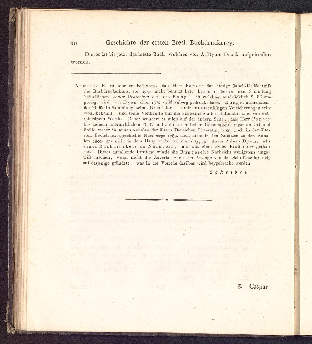 Aameik. Es ist sehr zu bedauren , dass Herr Panzer das hiesige Jubel -Gedächtnissder Buchdruckerkurist von 1740 nicht benutzt hat, besonders den in dieser Sammlungbefindlichen Actum Oratorium des seel. Runge, in weichern ausdrücklich S. 86 an-gezeigt wird , was Dyon schon 1512 zu Nürnberg gedruckt habe. Piunges ausnehmen-der Fleiss in Sammlung seiner Nachrichten ist mir aus zuverlässigen Versicherungen sehrwohl bekannt, und seine Verdienste um die Schlesische ältere Litteratur sind von ent-schiednem Werth. Daher wundert es mich auf der andern Seite, dass Herr Panzerbey seinem unermesslichen Fleiss und ausserordentlichen Genauigkeit, sogar an Ort undStelle weder m seinen Annalen der ältern Deutschen Litteratur, 1788· noch in der älte-sten Buchdruckergeschichte Nürnbergs 1789· auch nicht in den Zusätzen zu den Anna-len 1802· gar nicht in dem Hauptwerke der Annal typogr. dieses Adam Dyon , alseines Buchdruckers zu Nürnberg , nur mit einer Sylbe Erwähnung gethanhat. Dieser auffallende Umstand würde die Rung es ehe Nachricht wenigstens unge-wiss machen, wenn nicht die Zuverlässigkeit der Anzeige von der Schrift selbst sichauf dasjenige gründete , was in der Vorrede darüber wird beygebracht werden.