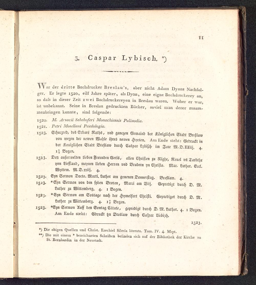 "War der dritte Buchdrucker B r e si au ' s, ah e r nicht Adam Dyons Nachfol-ger. Er legte 1520, eilt' Jahre später, alsDyon, eine eigne Buchdiuckerey an,so dais in dieser Zeit zwei Buchdruckereyen in Breslau waren. Woher er war,ist unbekannt. Seine in Breslau gedruckten Bücher, soviel man derer zusam-menbringen konnte, sind folgende: