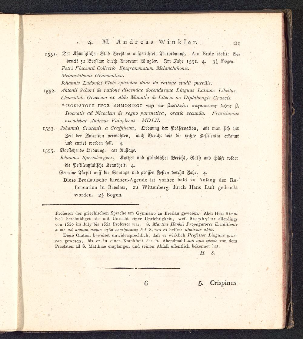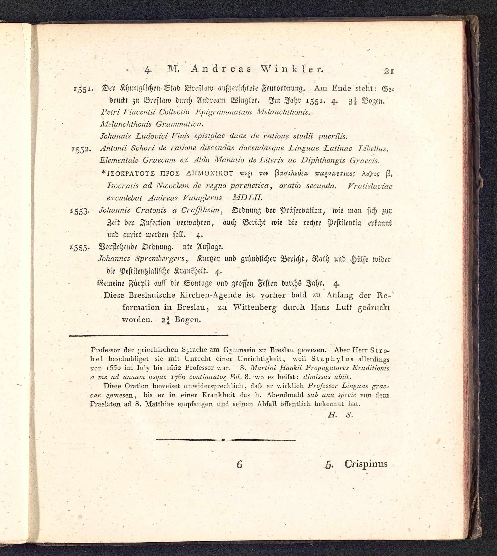1551. Der Khuniglichcn Stad Breßlaw aufgerichtete Feurordnung. Am Ende sieht:druckt zu Breslaw durch Andrcam Winglcr. Im Jahr 155 1. 4. 3| Bogen.Petri Vincentii Collectio Epigrammatum Mclanchthonis.Melanchthonis Grammatica .