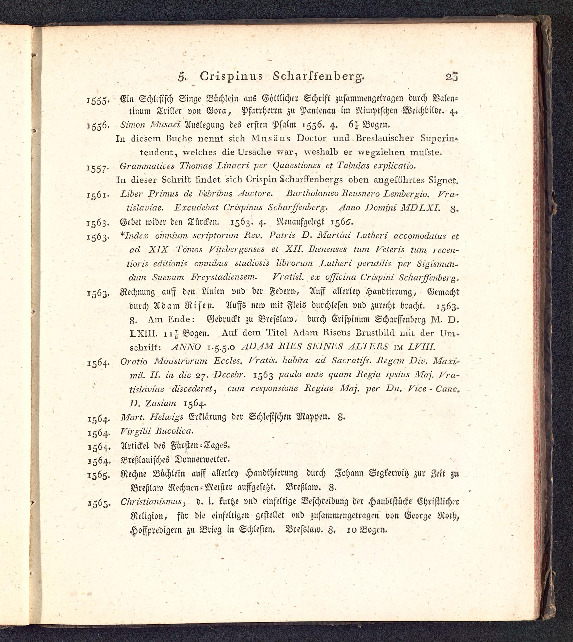 1563. *Index omnium scriptorum R.ev, Patris D. Martini Lutheri aecomodatus etad XIX Tomos Vitebergenses et XII. Ihenenses turn Vcleris turn recen-tioris editionis omnibus studiosis librorum Lutheri perutilis per Sigismuii-dum Suevum Freystadiensem. Vratisl. ex officina Crispini Scharffenberg.
