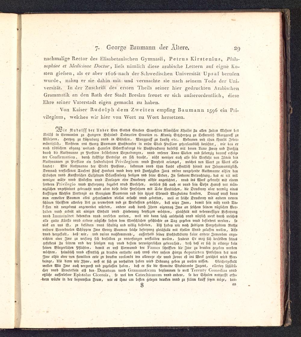 Xvir Rudolfs der Ander Bon Gottes Gnaden Ertpehtter Mimischer Khaiscr Zu allen Zeiten Mchrer dc»Neichß in Germanien zu Hungern Behaimb Dalmaricn Croaticn 2 c. Kbunig ErtzHertzog zu Oesterreich Marggraff zuMarhern, Hertzog zu Lätzenburg vnnd in Schlesien, Marggraff zu Lausitz etc. Bekennen vnd thun khundt Jeder-Nlânnistlich/ Nachdem vns Georg Baumann Buchdrucker in vnscr Stad Prcßlaw gchorsainblich berichtet, wie das ernach tödlichem abgang weiland Hannsen Scharffcnbcrgs die Wuchdruckercy daselbst mit denen Anno Away vnd Fünfzigdurch die Rathinanne zu Preßlaw beschehcner Bcgnadungcn, vnnd vnserer Anno Sieben vnd siebenzig darauf erfolg-ter Confirmation, durch kräftige Verträge an sich bracht, nicht weniger auch also sein Borfahr von Ihnen denRathmannen zu Preßlaw ein sonderbahres ^rivilsAMM vnnd Freyheit erlanget, welches von Wort zu Wort als»lautet: Wir Äathmanne der Stadt Preßlaw, bekennen vnnd thun kundt öffentlich hiemit vor Jcdcrmanniglich,Deninach verflossenes Tauscnt Fünf Hundert vnnd drey vnd Fünfzigsten Jars unsere vorgehende Rathmanne 0161« denErbahrn vnnd Kunstreichen Crispinum Scharffenbcrg seeligen vnd seine Erben, In sondcrer Betrachtung , das er nit mitweniger mühe vnnd Bnkosten vnnd Darlagcn eine Druckerey allhir angerichtet, vnnd ins Werk gebracht mit einemsondern Privilegio vnnd Bcfreyung begäbet vnnd Vorsehen, welches sich auch er vnnd sein Sohn Hanns! vor mân-niglichen vngehindcrt gebraucht vnnd aber diese beide Pcrsohnen mit Tode Verblichen, die Druckerey aber vermag aineskresstigcn Wchscn Vertrags an Ecoraium Baumann vnd sein itziges Eheweib Magdalcna komben. Darauf vnnß dannnun crmeltcr Bauman alles gchorsamben vleises ersucht vnnd gcbettcn, weil er solche Druckerey mit andern newcnschonen schrifftcn allerley Art zu vermehren vnd zu Verbessern gedächte, daß rater Inen, damit sein müh vnnd Vn-? sten nit vergebens angewendet würden, andere auch durch Ihren aigcnnutz Ime an solchem seinem nützlichen Vor-haben vnnd arbeit nit einigen Einhalt vnnd Hinderung beyfügen mochten, gleiä)fals mit vebcrmcssigcr Bcfreyungvnnd Immunitet bedcnckcn vnnd vorsehen wollen, weil wir dann solch ansehnlich vnnd nützlich werk durch welchesalle gutte Künste vnnd andere nützliche sachen dem Menschlichen geschlcchte an Tag gegeben vnnd befördert werden, soViet an vns ist, zu befodcrn vnns schuldig und willig befinden, Alß haben wir nach Zeitigem Vorgehabtem Rathevnserer Verordneten Schöppen Ime Georg Baunian solche bcfreyung gleichfalls mit theilen Vnnd zulassen wollen, Alsovnnd dergestalt, daß wir, vnd unsere nachkommend.', ausserhalb seiner BuchdrUckcrey faine andere Jemanden a »zu-richten oder Ime zu verfang sich derselben zu vnterfangcn verstatte» wollen , sondern Er mag sich derselben seinesgcfallcns Zu seinem und der scinigen nutz vnnd bestem verweigerlichcn gebrauchen , doch daß er sich in allwcgc beinseinen Bürgerlichen Pflichten, damit er vnß Berwannd der Famos schrifften die Ime zu drucken gegeben werdenmöchten, heimblich vnnd öffentlich zu drucken enthalte auch vnnß oder vnscrn Hierzu deputirten Pcrsohnen dcs wasIme alhir oder von frembdcn orte zn drucken vorkombt inn allewege ehe vnnd Zuvor eß ins Werk gerichtet wird Vor-bringe , Als dann wir Jhme , wcß er sich zu verhalten haben wird Ordnung geben zu wollen wissen. Glcichcrgcstaltwollen Wir Ime auch vergunst vnd zugelassen haben, daß er für die Gemeine Studierende Jugent, allerley schülbü-6 )er vnnd Tractctlein alß den Donatimi vnnd Grammaticam beysammen so woll Tercnty Comcdias vnndetzlichc ausserlesene Epistolas Cicerois, so wol den Catechi.smum vnnd andere, so der Schulen notturfft erfo--dern würde in der beqvemsten Form, wie es ihme am besten gelegen drucken vnnd zu feilem kauff setzen möge, dar-