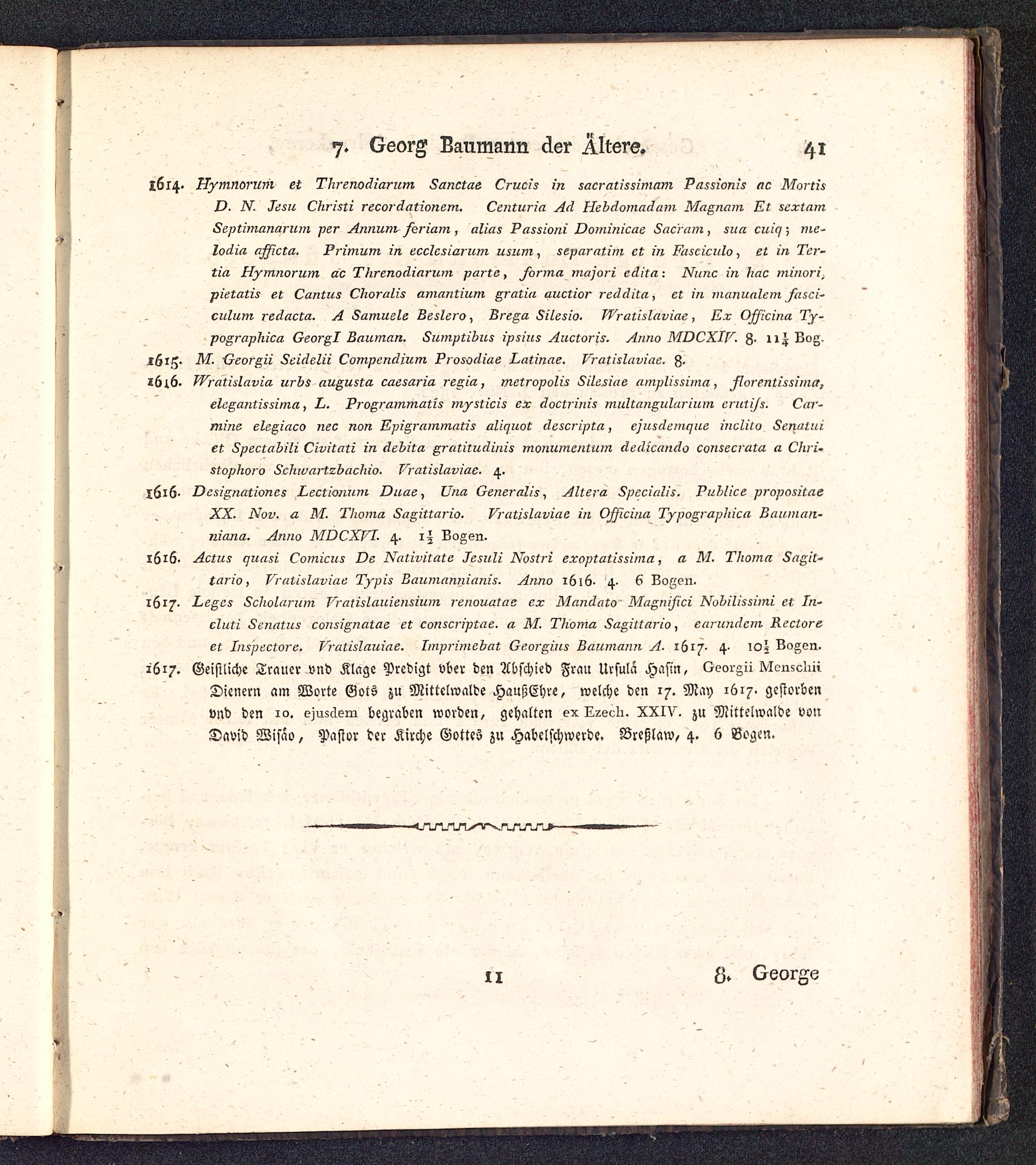 1617. Leges Scholarum T'ratislauiensium renouatae ex Mandato Magnifici Nobilissimi et In-eluti Senatus consignatae et conscripîae. a M. Thoma Sagittario , earundem Rectoreet Inspectore. Vratislauiae. Imprimebat Georgius Baumann A. 1617· 4· ιοί Bogen.