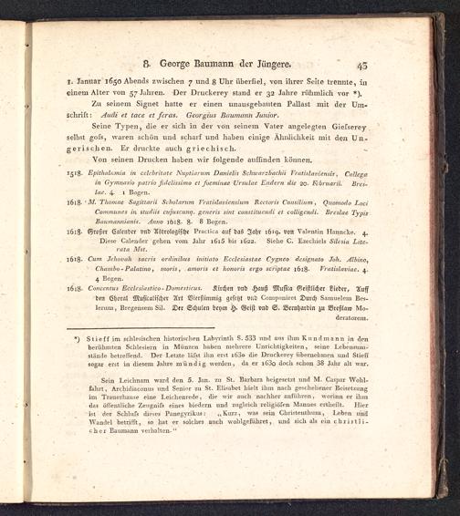 *) Stieff im schlesischen historischen Labyrinth S. 533 und ans ihm Kundmann in denberühmten Schlesiern in Münzen haben mehrere Unrichtigkeiten, seine Lebensuni-stände betreffend. Der Letzte lässt ihn erst 1630 die Druckerey übernehmen und Stieffsogar erst in diesem Jahre mündig werden, da er 1630 doch schon 38 Jahr alt war.