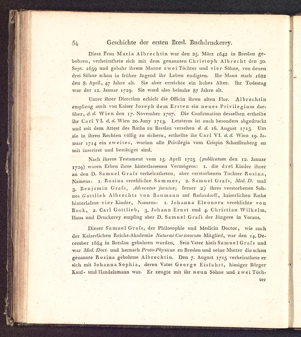 Unter ihrer Direction erhielt die Officin ihren alten Flor. Albrechtinempfieng auch von Kaiser Joseph dem Ersten ein neues Privilegium dar-über, cl cl. Wien den 17. November 1707. Die Confirmation desselben ertheilteihr Carl VI. d. d. Wien 20· Juny 1713. Letzteres ist auch besonders abgedrucktund mit dem Attest des Raths zu Breslau versehen d. d. 16. August 1713, Umsie in ihren Rechten völlig zu sichern, ertheilte ihr Carl VI. d.d. Wien 19. Ja-nuar 1714 ein zweites, worinn alle Privilegia vom Crispin Scharfsenberg anmit inseriret und bestätiget sind.