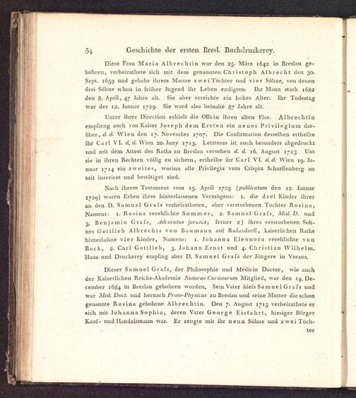 Nach ihrem Testament vom 15. April 172Z (publication den 12. JanuarI729) waren Erben ihre.-- hinterlassenen Vermögens: 1. die drei Kinder ihreran den D. Samuel Grafs verheiratheten, aber verstorbenen Tochter Rosina,Namens: 1. Rosina verehlichte Sommer, 2. Samuel Grass, Med. D. und3. Benjamin Grass, Adiocatus juralus; ferner 2) ihres verstorbenen Soh-nes Gottlieb Albrechts von Baumann auf Radaxdorff , kaiserlichen Rathshinterlassne vier Kinder, Namens: 1. Johanna Eleonora verehlichte vonBock, 2· Carl Gottlieb, 3. Johann Ernst und 4. Christian Wilhelm,Haus und Druckerey empfing aber D. Samuel Grass der Jüngere in Voraus.