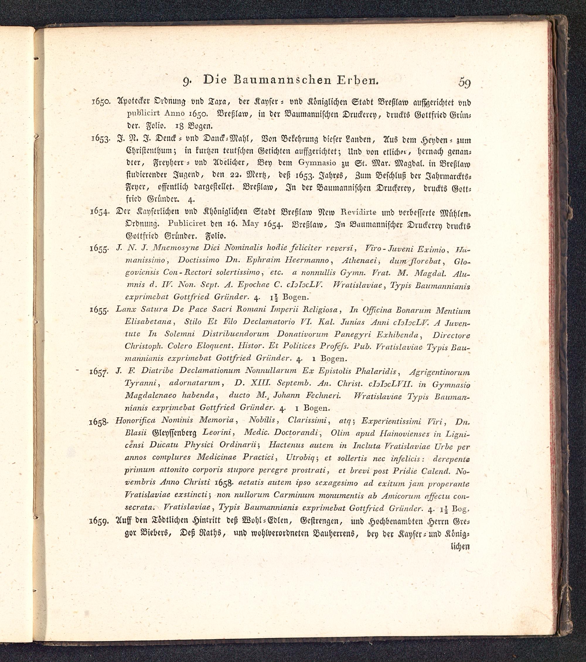 Ordnung. Publichet den 16. May 1654. Breßlaw, M» B.iumannischer Druckcrey drucktSGottfried Gründer. Folio.1655- J■ N. J. Mnemosyne Diei Nominaiis hodie féliciter rever si, Viro - Juveni Eximio, Hu-manissimo , Doctissimo On. Ephraim Heermanno , Alhenaei, dum florehat , Glo-goviensis Con - Rectori solertissimo , etc. a nonnulLis Gymn. Vrat. M. Magdal. Alu-mnis d. IV. Non. Sept. A. Epochac C. clolocLV. Wratislaviae , Typis Baumannianisczprimebat Gottfried Gründer. 4. 1| Bogen.