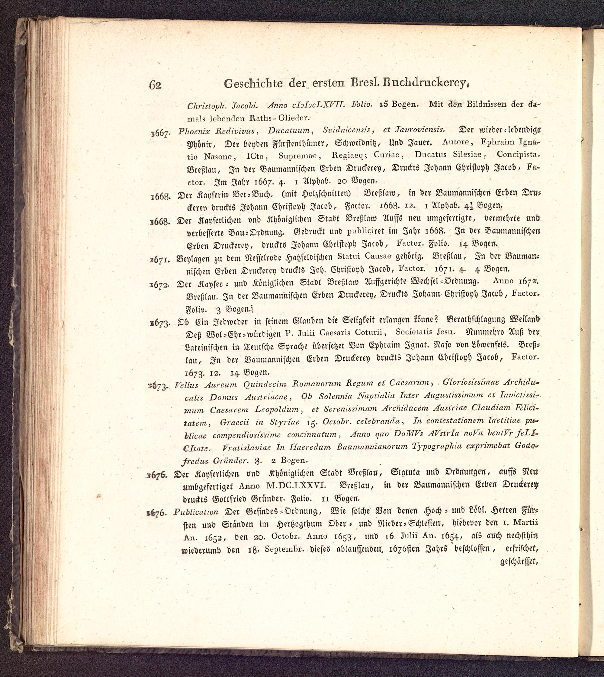 3676. Der Kayscrlichcn vnd Khöniglichen Stadt Brcßlau, Statuts und Ordnungen, auffs Neuumbgcfcrtiger Anno M.DC.LXXVI. Breßlau, in ver Baumannischen Erben Druckereydruckts Gottfried Gründer. Folio. 11 Bogen.