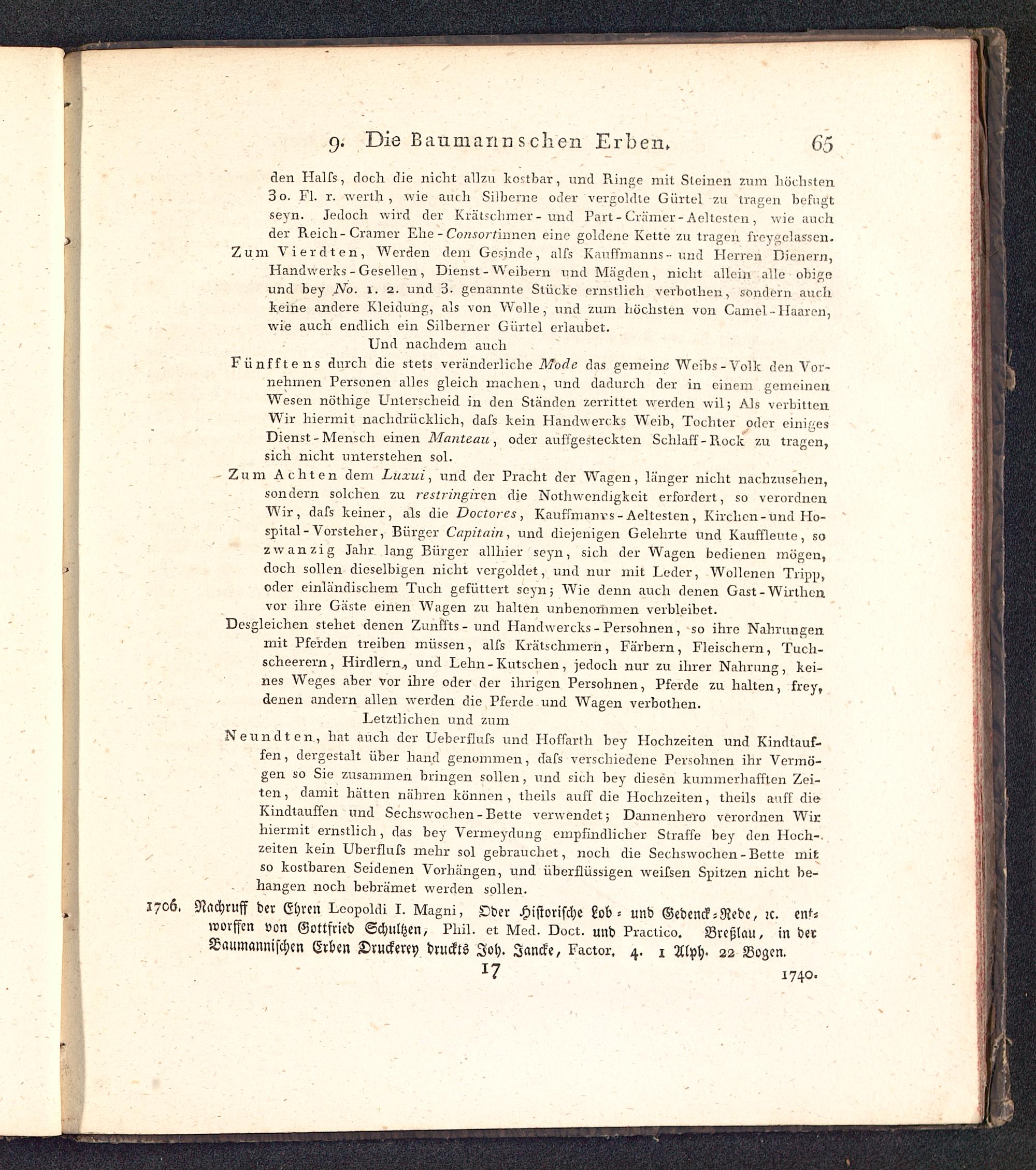 Neundten, hat auch der Ueberfluss und Hossarlh bey Hochzeiten und Kindtauf-sen, dergestalt über hand genommen , dass verschiedene Persohnen ihr Vermö-gen so Sie zusammen bringen sollen , und sich bey diesen kummerhafften Zei-ten, damit hätten nähren können, theils aufs die Hochzeiten, theils aufs disKindtauffen und Sechswochen - Bette verwendet; Dannenhero verordnen Wirhiermit ernstlich, das bey Vermeydung empfindlicher Strasse bey den Hoch-zeiten kein Uberhufs mehr sol gebrauchet, noch die Sechswochen - Bette mitso kostbaren Seidenen Vorhängen, und überflüssigen weissen Spitzen nicht be-hangen noch bebrämet werden sollen.706. Nachrufs der Ehren Leopoldi I. Magni, Oder Historische Lob - und Gedenck-Nede, κ. enf*worffcn von Gottfried Schultzen, Phil, et Med. Doct. und Practice. Breßlau, in derTaumannifchcn Erben Druckerey druckts Zoh. Jancke, Factor. 4. ! Alph. 22 Bogen.
