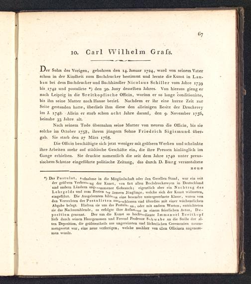 *) Das Postulat, Aufnahme in die Mitgliedschaft oder den Gesellen• Stand , war ein seitder grös־ern Verbren., ng ( \ ex Kunst, vcn fast allen Buchdruckereycn in Deutschland und andern Ländern angL״ ommener Gebrauch; eigentlich aber ein Nachtrag desLehrgelds und zum Besten 5 ar ìirmern Jünglinge, welche sich der Kunst widmeten,eingeführt. Die Ausgelernten bilrtLv״ n c } ne besondre untergeordnete Klasse , waren vonden Vorrechten der P os tulirt en ausschlössen und überdies mit einer wöchentlichenAbgabe belegt. Hielten sie um das Postula. an f üc ] er m j t andern Worten , entrichtetensie das Nachzuzahlende, so erfolgte ihre Aufnu\ nle i n einem feierlichen Actus, De-position genannt. Der um die Kunst so hochv^ r ]i e nte I m m a n u e 1 Β reit hop fliess durch seinen Hausgenossen und Freund Professor Schwabe an die Stelle der al-ten Deposition, die grösstenteils aus ungereimten und lächerlichen Ceremonien zusam-mengesetzt war , eine neue verfertigen, welche nachher von allen Ofikinen angenom-men wurde.