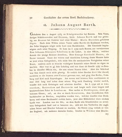 (jebohren den 1. August 1765 zu Κ önigswarthe bei Bauzen. Sein Vater,dasiger Schlossvervvalter und Occouom, hiess: Johann Β art 'fa und war gebür-tig aus Braune bei Camenz und seine Mutter: Maria Dorothea gebohrnsJäger. Nach dem Willen seines Vaters sollte Barth ein Kaufmann werden,der Sohn hingegen zeigte mehr Lust zum Buchdrucker. Die Umstände begün-stigten auch seine Neigung. Er kam im J. 1782 nach Bauzen zur verwittwetenFrau Johanna Eleonora Scholtzin in die Lehre, in eine Officin, welcherdamals dsr jetzige Besitzer derselben, Herr George Gott h old Monse, alsFactor vorstand. Unter der weisen und väterlichen Leitung dieses Mannes hatteer jetzt schon Gelegenheit, sich nicht blos die mechanischen Fertigkeiten seinerKunst, sondern auch so manche wichtigere Kenntniss seines Berufs zu eigen zumachen. Hier war er 4^ Jahr Lehrling und trat dann als Geselle 1787 zu Bres-lau in dieselbe Officin ein, die nun seinen Namen führt. Aber das Schicksalwar ihm damals noch nicht günstig. Er verliess daher Breslau drei Jahr darauf,nachdem er die letztern zwei Factor gewesen war, und ging über Berlin , Harn-burg und Kiel nach Kopenhagen . Am ersten und letztern Orte conditionirte ereine Zeit lang und nahm dann seinen Weg nach Hamburg wieder zurück,wandte sich nach Groningen und arbeitete daselbst. Im J. 1792 sah er Am-sterdam, Rotterdam und Dortrecht und langte nach einer langen undbeschwerlichen Fahrt in London an. Hier suchte er Heidingern, einen ge-bohrnen Ölsner, auf, an den er durch Kr eutzern, dem bischöflichen Hof-buchdrucker zu Breslau , empfohlen worden war, welcher daselbst eine Druk-kerey und einen Buchhandel etablirt hatte, jetzt aber Bibliothekar eines reichenLords war. London war der Ort, an dem Barth sein Künstlertalent zu erwei-tern Gelegenheit fand und er benutzte sie, sich mit den Vortheilen der en gli-sehen Setzer und Drucker bekannt zu machen. An Ostern 1794 verliess er wie-der England, sah mehrere deutsche Städte, brachte in Wismar eine Drucke-