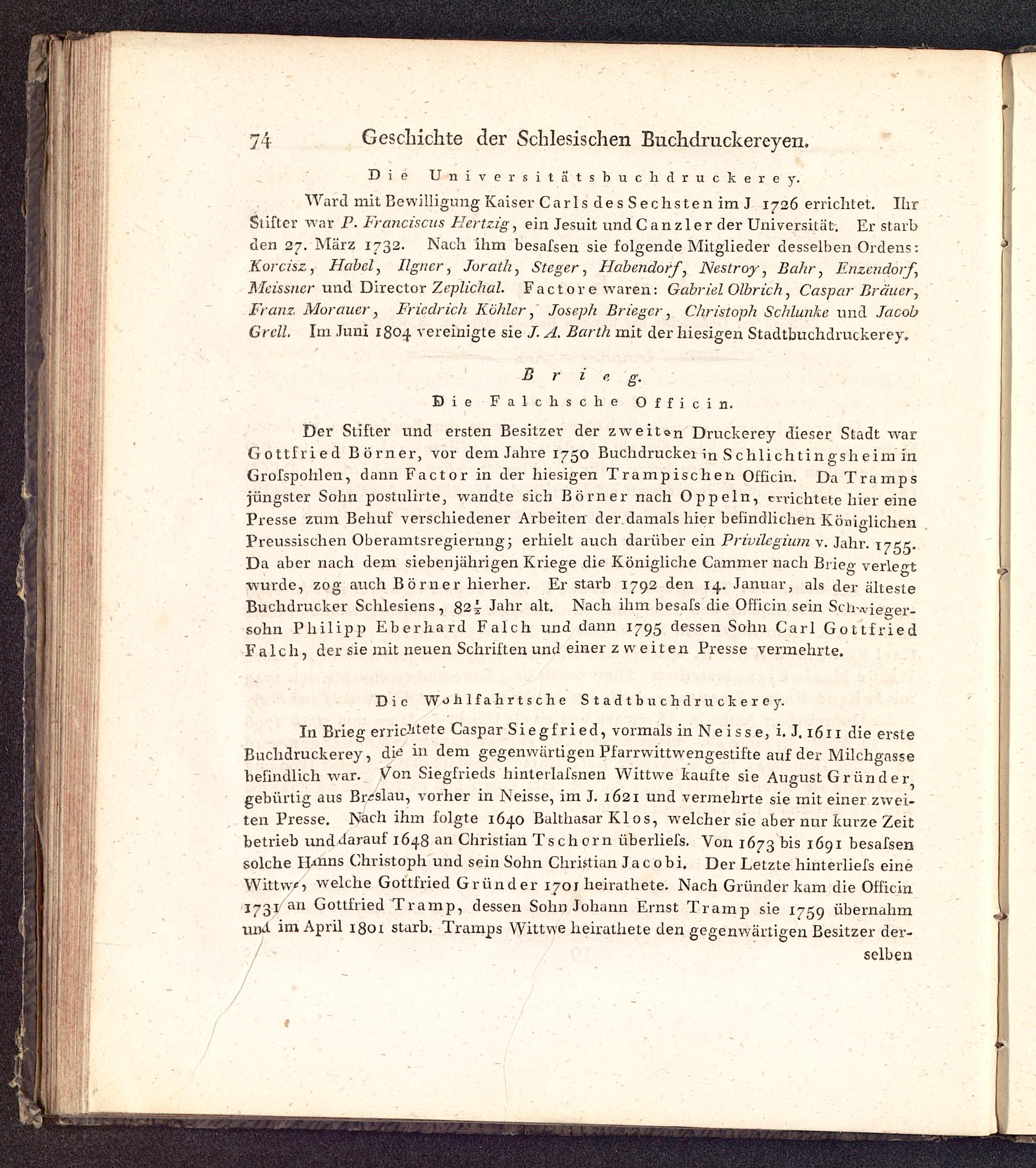 Der Stifter und ersten Besitzer der zweiten Druckerey dieser Stadt warGottfried Borner, vor dem Jahre 1750 Buchdrucker in Schlichtingsheim inGrosspohlen, dann Factor in der hiesigen Trampischen Officin. Da Trampsjüngster Sohn postuline, wandte sieb Börner nach Oppeln , errichtete hier einePresse zum Behuf verschiedener Arbeiten der damals hier befindlichen KöniglichenPreussischen Oberamtsregierung ; erhielt auch darüber ein Privilegium v. Jahr. 1755.Da aber nach dem siebenjährigen Kriege die Königliche Cammer nach Brieg verlegt■wurde, zog auch Börner hierher. Er starb 1792 den 14. Januar, als der ältesteBuchdrucker Schlesiens, 82 i Jahr alt. Nach ihm besass die Officin sein Sch-.vieger-söhn Philipp Eberhard F a 1 ch und dann 1795 dessen Sohn Carl GottfriedFalch, der sie mit neuen Schriften und einer ζ weiten Presse vermehrte.