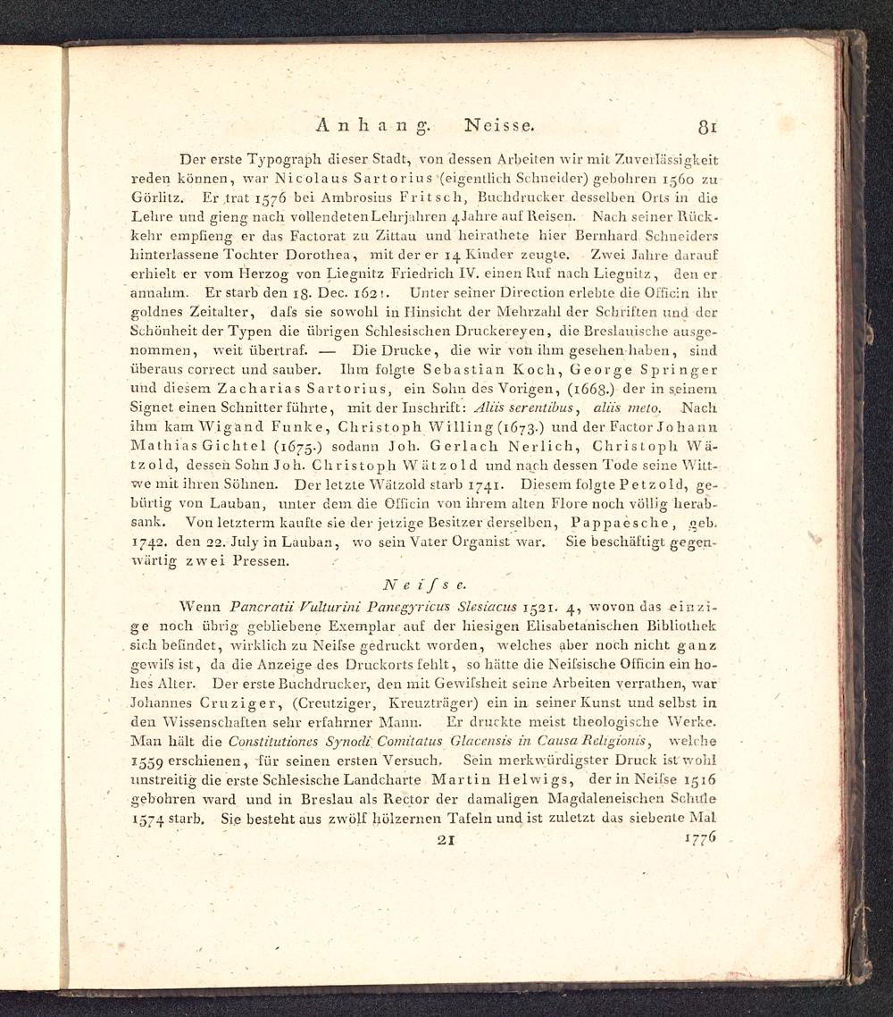 Der erste Typograph dieser Stadt, von dessen Arbeiten wir mit Zuverlässigkeitreden können, war Nicolaus Sartorius (eigentlich Schneider) gebohren 1560 zuGörlitz . Er trat 1576 bei Ambrosias Fritsch, Buchdrucker desselben Orts in dieLehre und gieng nach vollendeten Lehrjahren ^Jahre auf Reisen. Nach seiner Rück-kebr empsieng er das Factorat zu Zittau und heirathete hier Bernhard Schneidershinterlassene Tochter Dorothea, mit der er 14 Kinder zeugte. Zwei Jahre darauferhielt er vom Herzog von Liegnitz Friedrich IV. einen Ruf nach Liegnitz , den erannahm. Er starb den 1Z. Dec. 162!. Unter seiner Direction erlebte die Officin ihrgoldnes Zeitalter, dass sie sowohl in Hinsicht der Mehrzahl der Schriften und derSchönheit der Typen die übrigen Schlesischen Druckereyen , die Breslauische ausge-nommen, weit übertraf. — Die Drucke , die wir von ihm gesehen haben , sindüberaus correct und sauber. Ihm folgte Sebastian Koch, George Springerund diesem Zac h arias Sartorius, ein Sohn des Vorigen, (1668·) der in seinemSignet einen Schnitter führte, mit der Inschrift: Äliis serentibus , aliis melo. Nachihm kam Wig'and Funke, Christoph Willing (1673.) und der Factor Jo hannMathias Gichtel (1675·) sodann Joh. Gerlach Nerlich, Christoph W ä-t ζ ο 1 d, dessen Sohn Joh. Christo p h W ä t ζ ο 1 d und nach dessen Tode seine Witt-we mit ihren Söhnen. Der letzte Wätzold starb 17.fi. Diesem folgte Ρ e t ζ ο Id, ge-bürtig von Lauban , unter dem die Officin von ihrem alten Flore noch völlig herab-sank. Von letzterm kaufte sie der jetzige Besitzer derselben , P a p p a e s che , .2 ׳ eb.1742. den 22. July in Lauban , wo sein Vater Organist war. Sie beschäftigt gegen-wartig zwei Pressen.