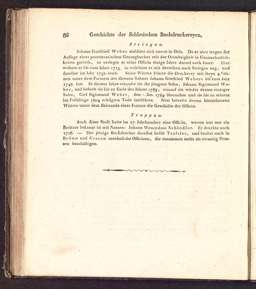 Johann Gottfried Weber etablirte sich zuerst in Oels. Da er aber wegen derAuflage eines protestantischen Gesangbuches mit der Ortsobrigkeit in Unannehmlich-keilen gerieth, so verlegte er seine Officin einige Jahre darauf nach Jauer. Hierwohnte er bis zum Jahre 1715, in welchem er mit derselben nach Striegau zog, unddaselbst im Jahr 1732· starb. Seine Wittwe führte die Druckerey mit ihren 4 Söh-nen unter demFactorat des ältesten Sohnes Johann Gottfried Webers bis zum Jahr174S■ fort Ih diesem Jahre erkaufte sie ihr jüngster Sohn , Johann Sigismund We-ber, und behielt sie bis zu Ende des Jahres J783 , worauf sie wieder dessen einzigerSohn, Carl Sigismund Weber, den r. Jan. 1784· übernahm und sie bis zu seinemim Frühlinge 1804 erfolgten Tode fortführte. Jetzt betreibt dessen hinterlasseneWittwe unter dem Beistände eines Factors die Geschäfte der Officin.