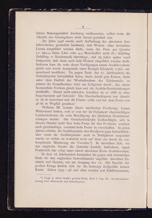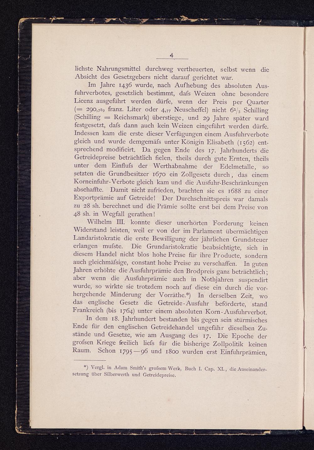 Wilhelm III. konnte dieser unerhörten Forderung keinenWiderstand leisten, weil er von der im Parlament übermächtigenLandaristokratie die erste Bewilligung der jährlichen Grundsteuererlangen mufste. Die Grundaristokratie beabsichtigte, sich indiesem Handel nicht blos hohe Preise für ihre Producte, sondernauch gleichmäfsige, constant hohe Preise zu verschaffen. In gutenJahren erhöhte die Ausfuhrprämie den Brodpreis ganz beträchtlich;aber wenn die Ausfuhrprämie auch in Nothjahren suspendirtwurde, so wirkte sie trotzdem noch auf diese ein durch die vor-hergehende Minderung der Vorräthe.*) In derselben Zeit, wodas englische Gesetz die Getreide-Ausfuhr beförderte, standFrankreich (bis 1764) unter einem absoluten Korn-Ausfuhrverbot.