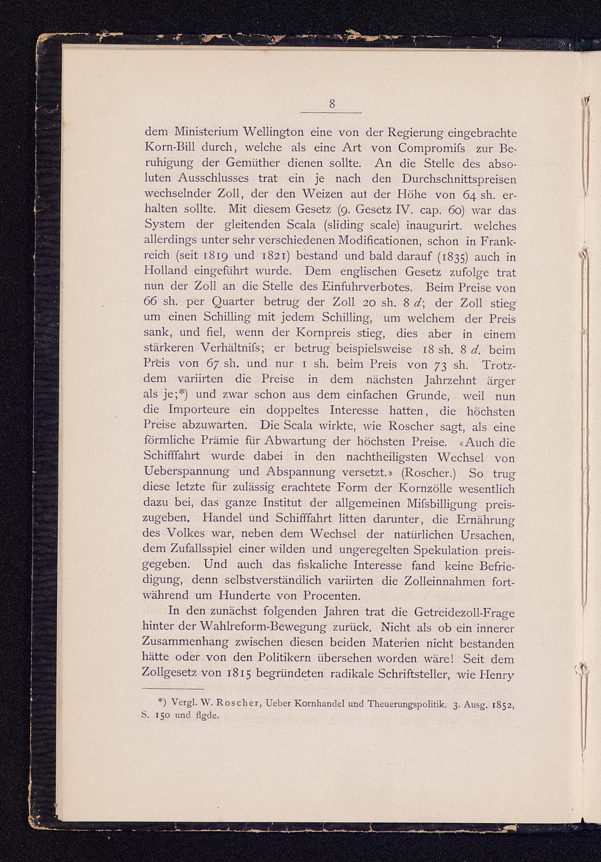 dem Ministerium Wellington eine von der Regierung eingebrachteKorn-Bill durch, welche als eine Art von Compromifs zur Be-ruhigung der Gemüther dienen sollte. An die Stelle des abso-luten Ausschlusses trat ein je nach den Durchschnittspreisenwechselnder Zoll, der den Weizen aut der Höhe von 64 sh. er-halten sollte. Mit diesem Gesetz (9. Gesetz IV. cap. 60) war dasSystem der gleitenden Scala (sliding scale) inaugurirt. welchesallerdings unter sehr verschiedenen Modificationen, schon in Frank-reich (seit 1819 und 1821) bestand und bald darauf (1835) auch inHolland eingeführt wurde. Dem englischen Gesetz zufolge tratnun der Zoll an die Stelle des Einfuhrverbotes. Beim Preise von66 sh. per Quarter betrug der Zoll 20 sh. 8 d\ der Zoll stiegum einen Schilling mit jedem Schilling, um welchem der Preissank, und fiel, wenn der Kornpreis stieg, dies aber in einemstärkeren Verhältnifs; er betrug beispielsweise 18 sh. 8 d. beimPrfcis von 67 sh. und nur 1 sh. beim Preis von 73 sh. Trotz-dem variirten die Preise in dem nächsten Jahrzehnt ärgerals je;*) und zwar schon aus dem einfachen Grunde, weil nundie Importeure ein doppeltes Interesse hatten, die höchstenPreise abzuwarten. Die Scala wirkte, wie Roscher sagt, als eineförmliche Prämie für Abwartung der höchsten Preise. «Auch dieSchifffahrt wurde dabei in den nachtheiligsten Wechsel vonUeberspannung und Abspannung versetzt.» (Roscher.) So trugdiese letzte für zulässig erachtete Form der Kornzölle wesentlichdazu bei, das ganze Institut der allgemeinen Mifsbilligung preis-zugeben. Handel und Schifffahrt litten darunter, die Ernährungdes Volkes war, neben dem Wechsel der natürlichen Ursachen,dem Zufallsspiel einer wilden und ungeregelten Spekulation preis-gegeben. Und auch das fiskaliche Interesse fand keine Befrie-digung, denn selbstverständlich variirten die Zolleinnahmen fort-während um Hunderte von Procenten.