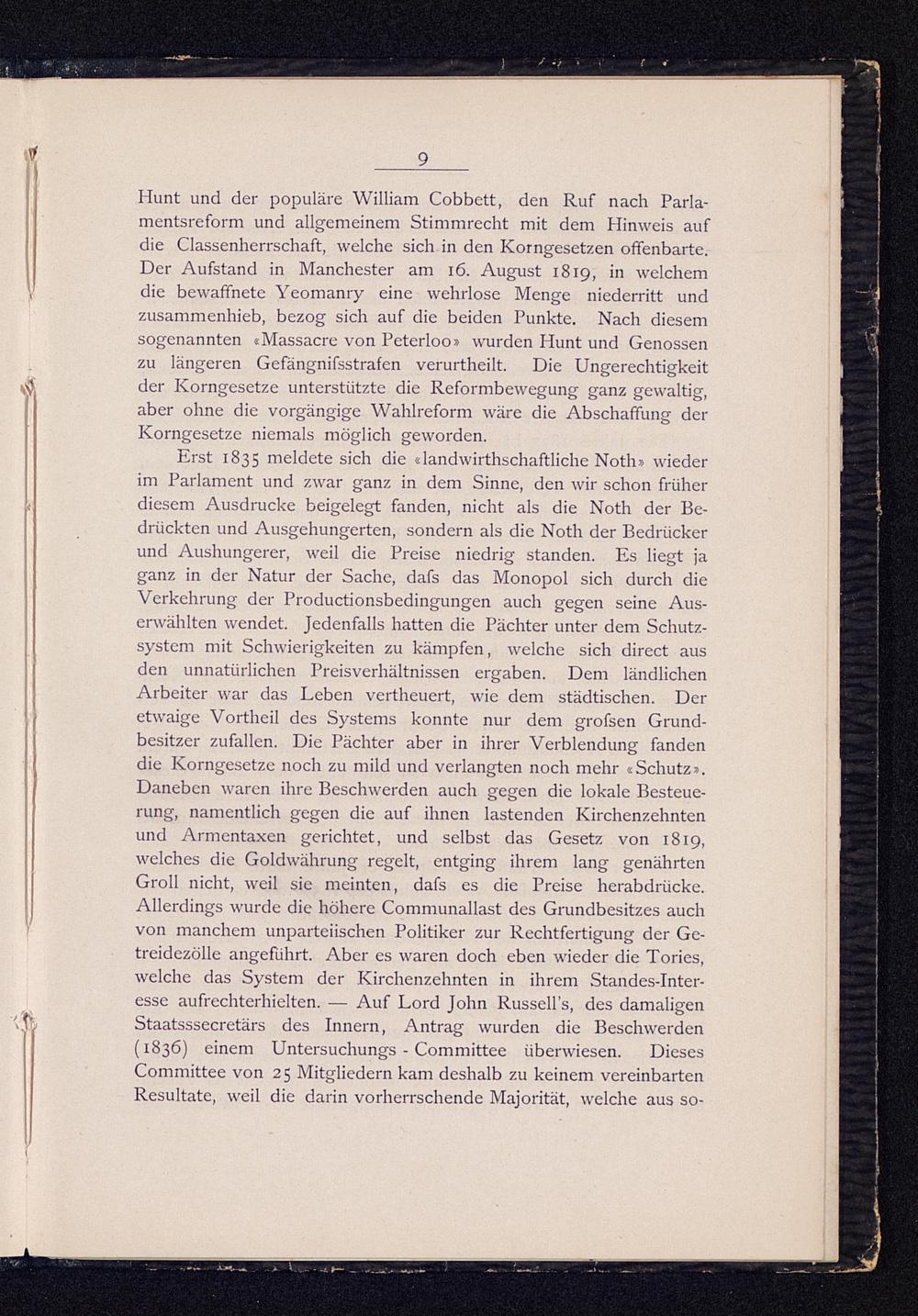 Hunt und der populäre William Cobbett , den Ruf nach Parla-mentsreform und allgemeinem Stimmrecht mit dem Hinweis aufdie Classenherrschaft, welche sich in den Korngesetzen offenbarte.Der Aufstand in Manchester am 16. August 1819, in welchemdie bewaffnete Yeomanry eine wehrlose Menge niederritt undzusammenhieb, bezog sich auf die beiden Punkte. Nach diesemsogenannten «Massacre von Peterloo» wurden Hunt und Genossenzu längeren Gefängnifsstrafen verurtheilt. Die Ungerechtigkeitder Korngesetze unterstützte die Reformbewegung ganz gewaltig,aber ohne die vorgängige Wahlreform wäre die Abschaffung derKorngesetze niemals möglich geworden.