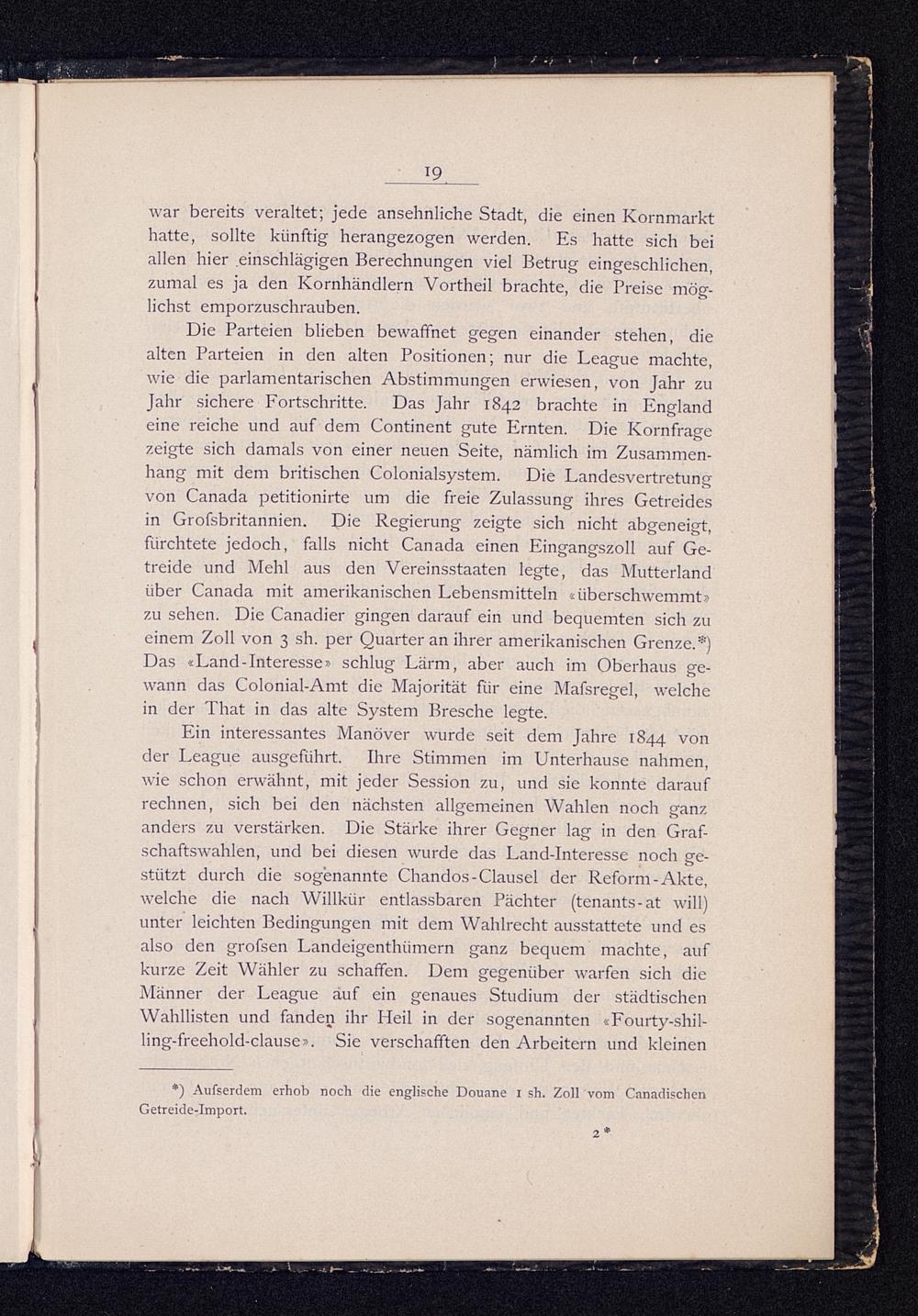 Ein interessantes Manöver wurde seit dem Jahre 1844 vonder League ausgeführt. Ihre Stimmen im Unterhause nahmen,wie schon erwähnt, mit jeder Session zu, und sie konnte daraufrechnen, sich bei den nächsten allgemeinen Wahlen noch ganzanders zu verstärken. Die Stärke ihrer Gegner lag in den Graf-schaftswahlen, und bei diesen wurde das Land-Interesse noch ge-stützt durch die sogenannte Chandos-Clausei der Reform-Akte,welche die nach Willkür entlassbaren Pächter (tenants-at will)unter leichten Bedingungen mit dem Wahlrecht ausstattete und esalso den grofsen Landeigenthiimern ganz bequem machte, aufkurze Zeit Wähler zu schaffen. Dem gegenüber warfen sich dieMänner der League auf ein genaues Studium der städtischenWahllisten und fanden ihr Heil in der sogenannten «Fourty-shil-ling-freehold-clause». Sie verschafften den Arbeitern und kleinen