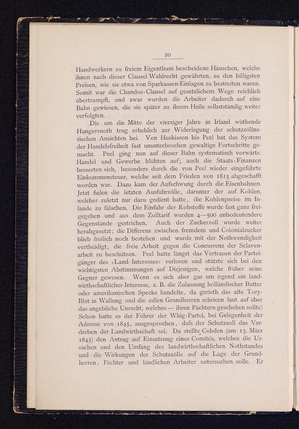 Die um die Mitte der vierziger Jahre in Irland wüthendeHungersnoth trug erheblich zur Widerlegung der schutzzöllne-rischen Ansichten bei. Von Huskisson bis Peel hat das Systemder Handelsfreiheit fast ununterbrochen gewaltige Fortschritte ge-macht. Peel ging nun auf dieser Bahn systematisch vorwärts.Handel und Gewerbe blühten auf; auch die Staats - Finanzenbesserten sich, besonders durch die von Peel wieder eingeführteEinkommensteuer, welche seit dem Frieden von 1815 abgeschafftworden war. Dazu kam der Aufschwung durch die Eisenbahnen.Jetzt fielen die letzten Ausfuhrzölle, darunter der auf Kohlen,welcher zuletzt nur dazu gedient hatte, die Kohlenpreise im In-lande zu fälschen. Die Einfuhr der Rohstoffe wurde fast ganz frei-gegeben und aus dem Zolltarif wurden 4—500 unbedeutendereGegenstände gestrichen. Auch der Zuckerzoll wurde weiterherabgesetzt; die Differenz zwischen fremdem und Colonialzuckerblieb freilich noch bestehen und wurde mit der Nothwendigkeitvertheidigt, die freie Arbeit gegen die Concurrenz der Sclaven-arbeit zu beschützen. Peel hatte längst das Vertrauen der Partei-gänger des «Land-Interesses» verloren und stützte sich bei denwichtigsten Abstimmungen auf Diejenigen, welche früher seineGegner gewesen. Wenn es sich aber gar um irgend ein land-wirtschaftliches Interesse, z. B. die Zulassung holländischer Butteroder amerikanischen Specks handelte, da gerieth das alte Tory-Blut in Wallung und die edlen Grundherren schrieen laut auf überdas angebliche Unrecht, welches — ihren Pächtern geschehen sollte!Schon hatte es der Führer der Whig-Partei, bei Gelegenheit derAdresse von 1845, ausgesprochen, dafs der Schutzzoll das Ver-derben der Landwirthschaft sei. Da stellte^Cobden (am 13. März1845) den Antrag auf Einsetzung eines Comites, welches die Ur-sachen und den Umfang des landwirtschaftlichen Notstandesund die Wirkungen der Schutzzölle auf die Lage der Grund-herren, Pächter und ländlichen Arbeiter untersuchen solle. Er