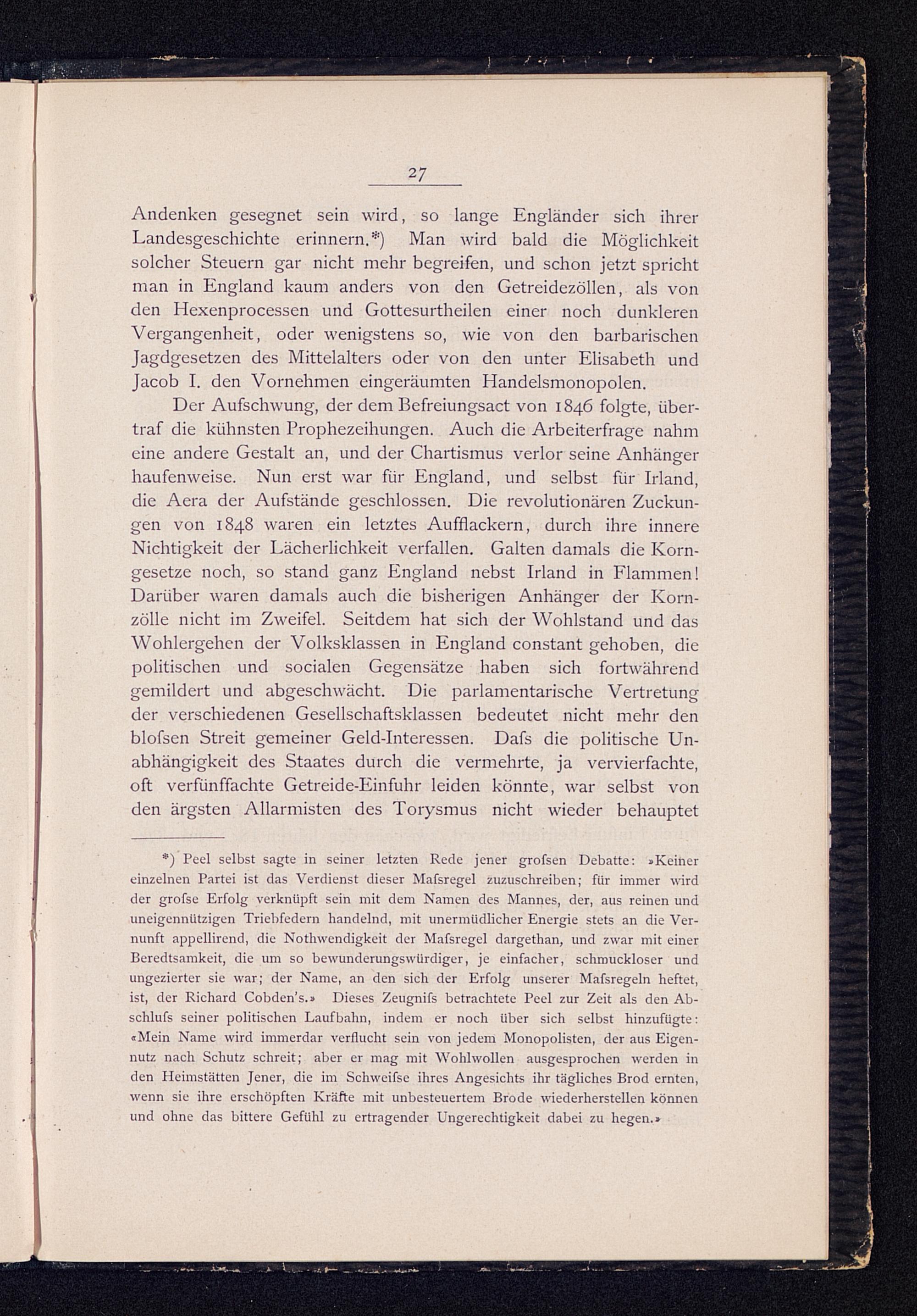 *) Peel selbst sagte in seiner letzten Rede jener grofsen Debatte: »Keinereinzelnen Partei ist das Verdienst dieser Malsregel zuzuschreiben; für immer wirdder grofse Erfolg verknüpft sein mit dem Namen des Mannes, der, aus reinen unduneigennützigen Triebfedern handelnd, mit unermüdlicher Energie stets an die Ver-nunft appellirend, die Nothwendigkeit der Mafsregcl dargethan, und zwar mit einerBeredtsamkeit, die um so bewunderungswürdiger, je einfacher, schmuckloser undungezierter sie war; der Name, an den sich der Erfolg unserer Mafsregeln heftet,ist, der Richard Cobden’s .» Dieses Zeugnifs betrachtete Peel zur Zeit als den Ab-schlufs seiner politischen Laufbahn, indem er noch Uber sich selbst hinzufügte:«Mein Name wird immerdar verflucht sein von jedem Monopolisten, der aus Eigen-nutz nach Schutz schreit; aber er mag mit Wohlwollen ausgesprochen werden inden Heimstätten Jener, die im Schweifse ihres Angesichts ihr tägliches Brod ernten,wenn sie ihre erschöpften Kräfte mit unbesteuertem Brode wiederherstellen könnenund ohne das bittere Gefühl zu ertragender Ungerechtigkeit dabei zu hegen.»