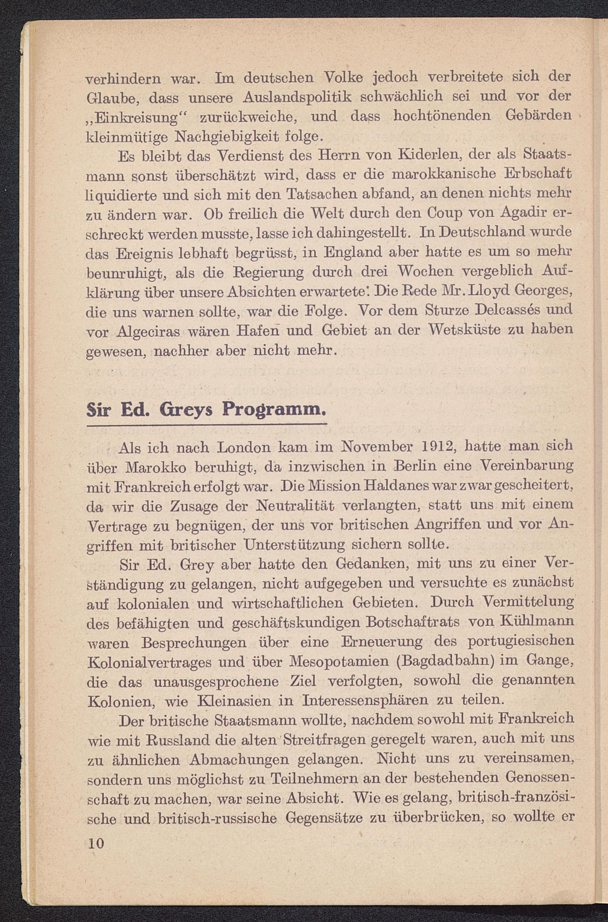 Sir Ed. Grey aber hatte den Gedanken, mit uns zu einer Ver-ständigung zu gelangen, nicht aufgegeben und versuchte es zunächstauf kolonialen und wirtschaftlichen Gebieten. Durch Vermittelungdes befähigten und geschäftskundigen Botschaftrats von Kühlmannwaren Besprechungen über eine Erneuerung des portugiesischenKolonialvertrages und über Mesopotamien (Bagdadbahn ) im Gange,die das unausgesprochene Ziel verfolgten, sowohl die genanntenKolonien, wie Kleinasien in Interessensphären zu teilen.