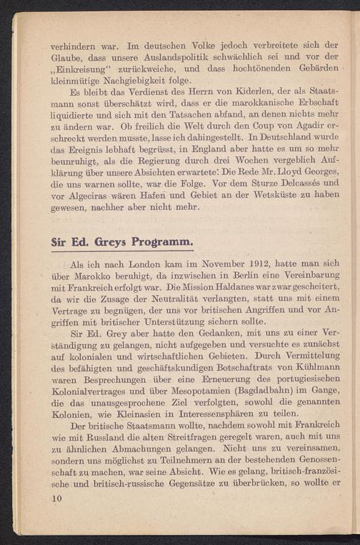 Als ich nach London kam im November 1912, hatte man sichüber Marokko beruhigt, da inzwischen in Berlin eine Vereinbarungmit Frankreich erfolgt war. Die Mission Haldanes war zwar gescheitert,da wir die Zusage der Neutralität verlangten, statt uns mit einemVertrage zu begnügen, der uns vor britischen Angriffen und vor An-griffen mit britischer Unterstützung sichern sollte.