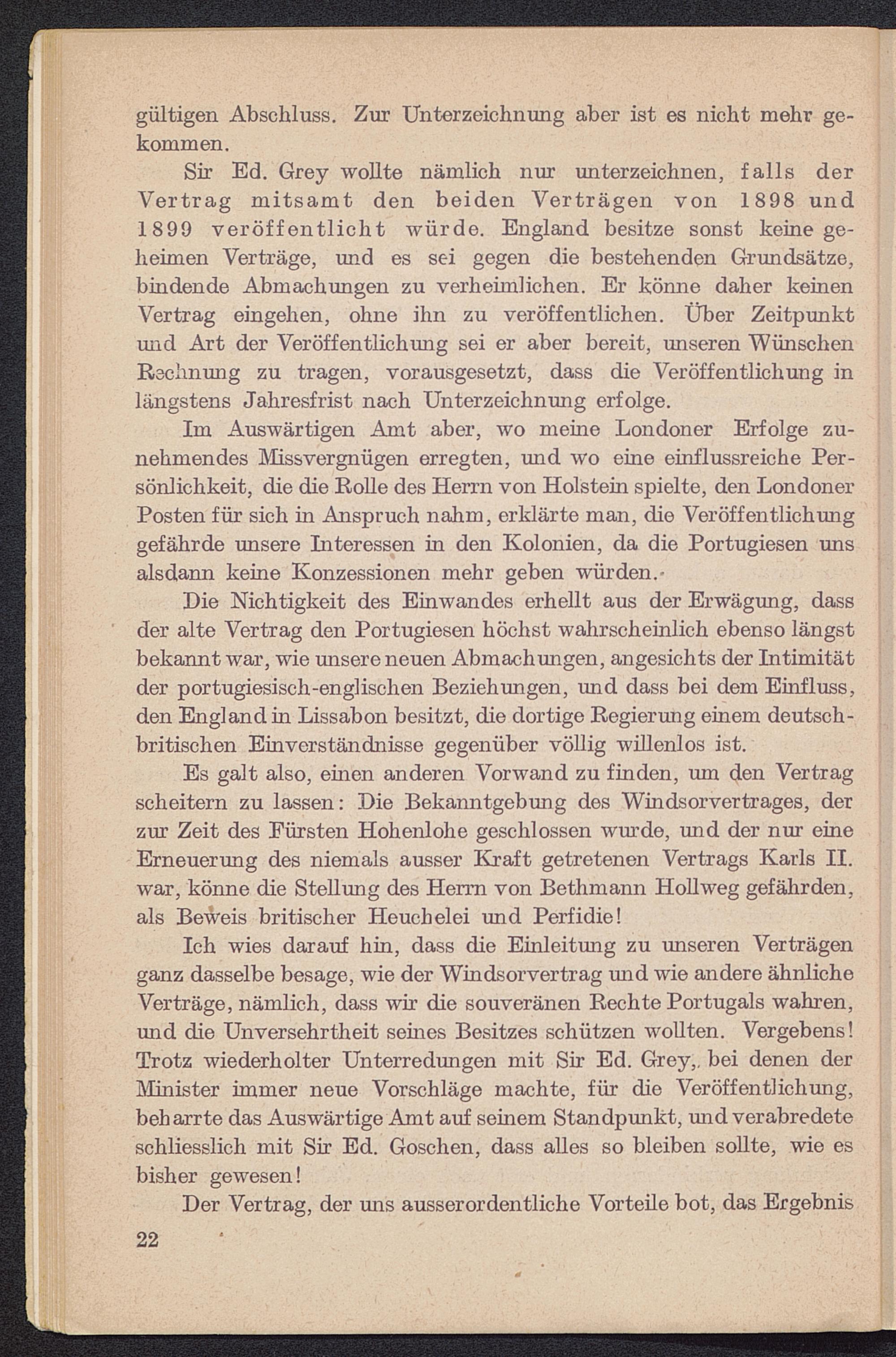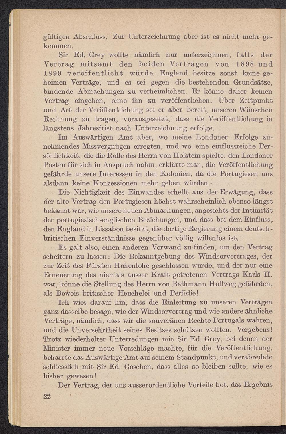 Ich wies darauf hin, dass die Einleitung zu unseren Verträgenganz dasselbe besage, wie der Windsorvertrag und wie andere ähnlicheVerträge, nämlich, dass wir die souveränen Rechte Portugals wahren,und die Unversehrtheit seines Besitzes schützen wollten. Vergebens!Trotz wiederholter Unterredungen mit Sir Ed. Grey, . bei denen derMinister immer neue Vorschläge machte, für die Veröffentlichung,beharrte das Auswärtige Amt auf seinem Standpunkt, und verabredeteschliesslich mit Sir Ed. Goschen, dass alles so bleiben sollte, wie esbisher gewesen!