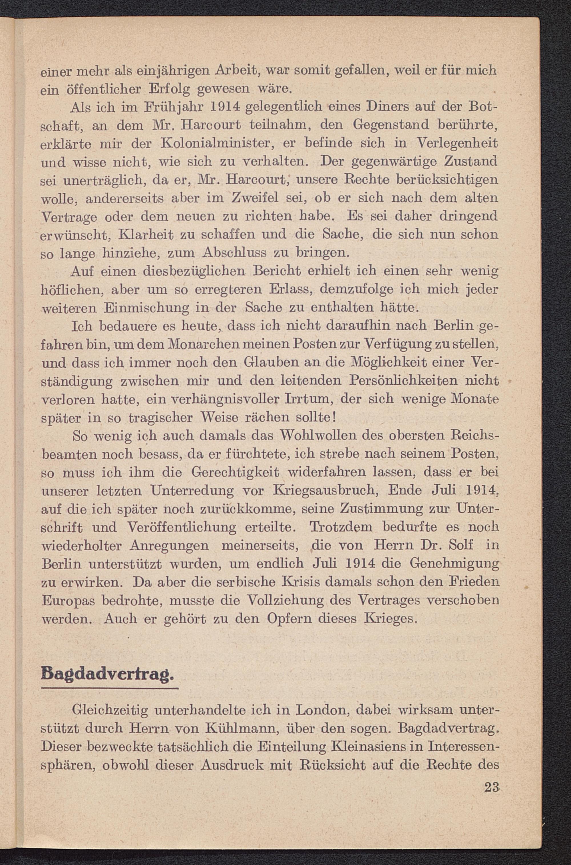 Als ich im Frühjahr 1914 gelegentlich eines Diners auf der Bot-schaft, an dem Mi’. Harcourt teilnahm, den Gegenstand berührte,erklärte mir der Kolonialminister, er befinde sich in Verlegenheitund wisse nicht, wie sich zu verhalten. Der gegenwärtige Zustandsei unerträglich, da er, Air. Harcourt, unsere Rechte berücksichtigenwolle, andererseits aber im Zweifel sei, ob er sich nach dem altenVertrage oder dem neuen zu richten habe. Es sei daher dringenderwünscht, Klarheit zu schaffen und die Sache, die sich nun schonso lange hinziehe, zum Abschluss zu bringen.