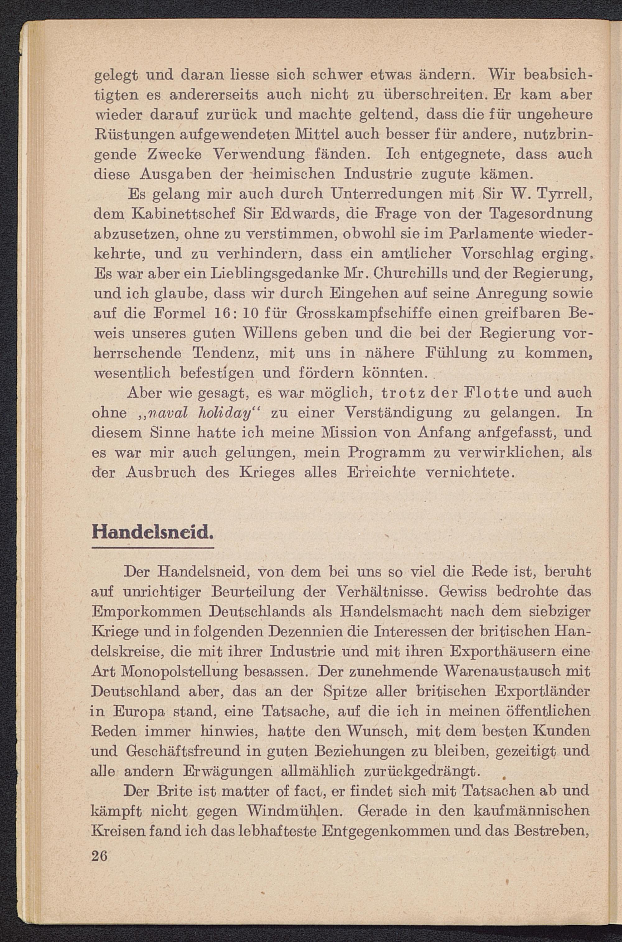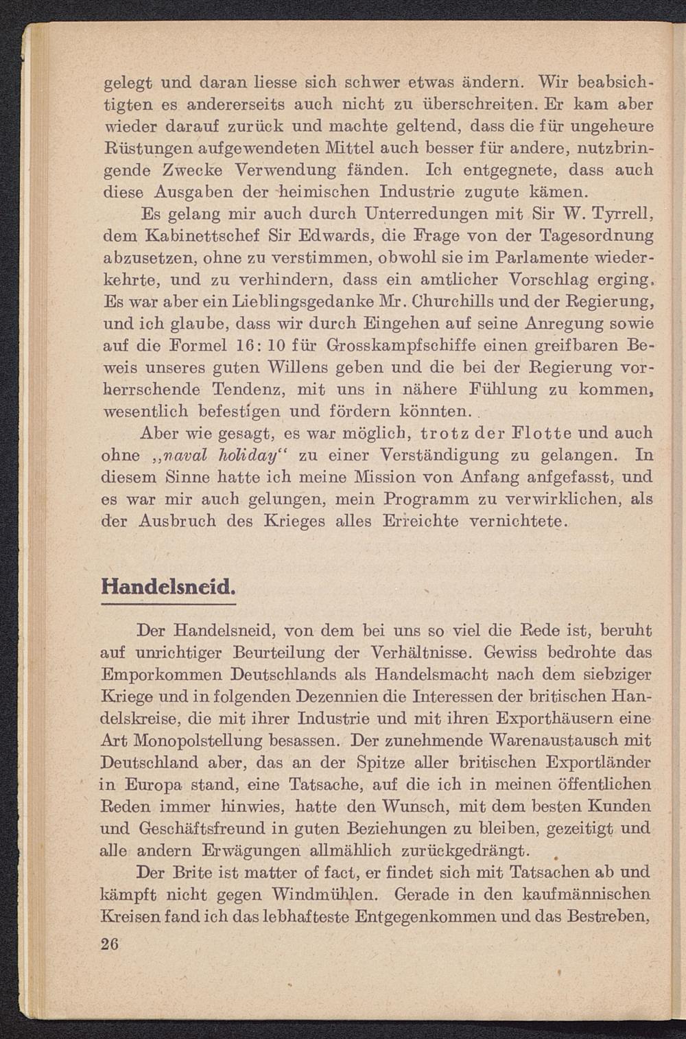 Aber wie gesagt, es war möglich, trotz der Flotte und auchohne ,,naval holiday“ zu einer Verständigung zu gelangen. Indiesem Sinne hatte ich meine Mission von Anfang anfgefasst, undes war mir auch gelungen, mein Programm zu verwirklichen, alsder Ausbruch des Krieges alles Erreichte vernichtete.