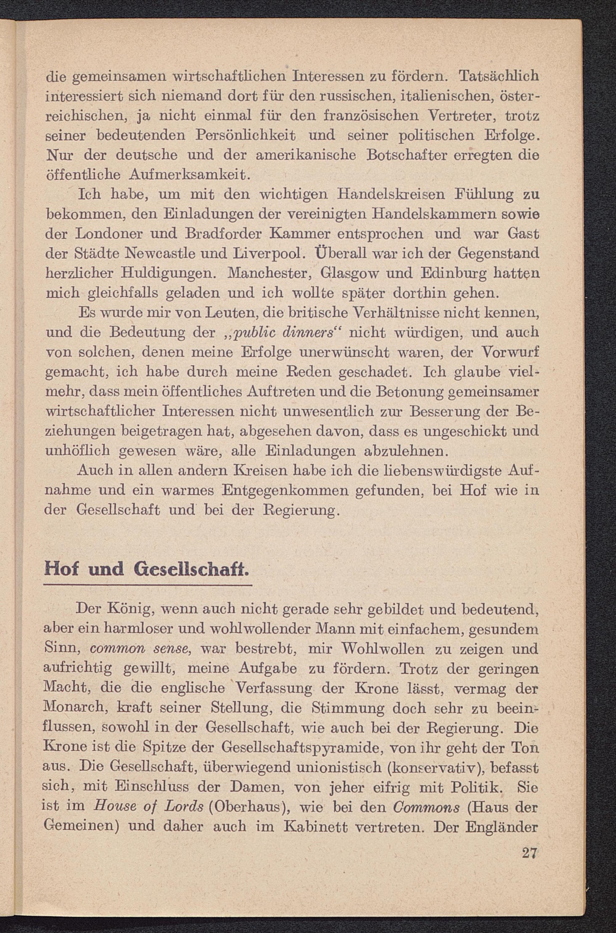 Der König, wenn auch nicht gerade sehr gebildet und bedeutend,aber ein harmloser und wohl wollender Mann mit einfachem, gesundemSinn, common sense, war bestrebt, mir Wohlwollen zu zeigen undaufrichtig gewillt, meine Aufgabe zu fördern. Trotz der geringenMacht, die die englische Verfassung der Krone lässt, vermag derMonarch, kraft seiner Stellung, die Stimmung doch sehr zu beein-flussen, sowolil in der Gesellschaft, wie auch bei der Regierung. DieKrone ist die Spitze der Gesellschaftspyramide, von ihr geht der Tonaus. Die Gesellschaft, überwiegend unionistisch (konservativ), befasstsich, mit Einscliluss der Damen, von jeher eifrig mit Politik. Sieist im House of Lords ( Oberhaus), wie bei den Commons (Haus derGemeinen) und daher auch im Kabinett vertreten. Der Engländer