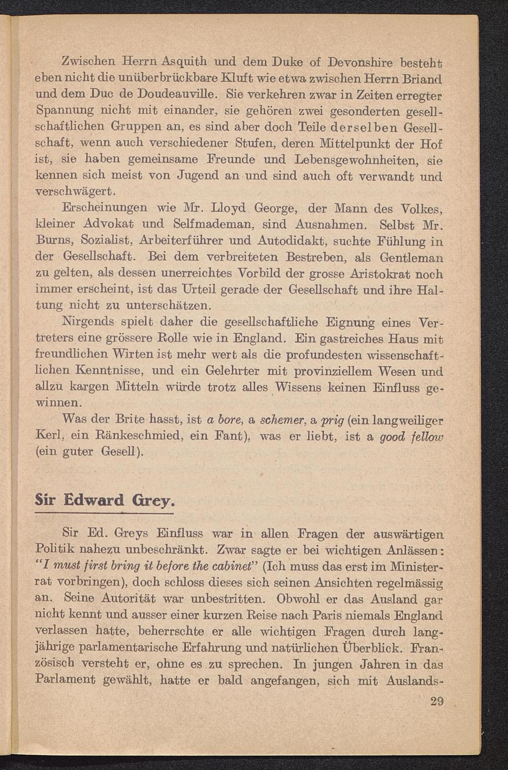 Erscheinungen wie Mr. Lloyd George , der Mann des Volkes,kleiner Advokat und Selfmademan, sind Ausnahmen. Selbst Mr.Burns, Sozialist, Arbeiterführer und Autodidakt, suchte Fühlung inder Gesellschaft. Bei dem verbreiteten Bestreben, als Gentlemanzu gelten, als dessen unerreichtes Vorbild der grosse Aristokrat nochimmer erscheint, ist das Urteil gerade der Gesellschaft und ihre Hal-tung nicht zu unterschätzen.