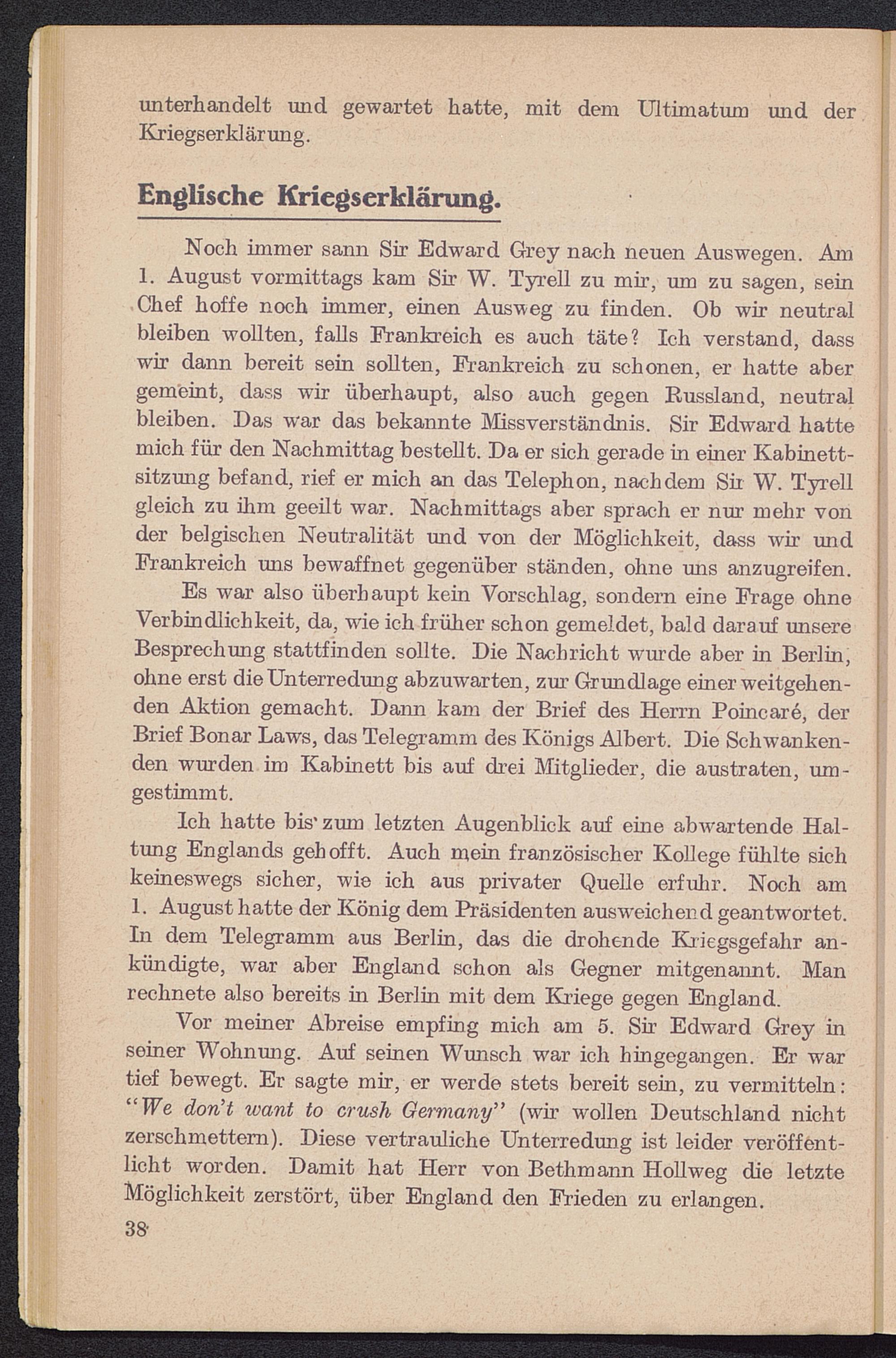 Vor meiner Abreise empfing mich am 5. Sir Edward Grey inseiner Wohnung. Auf seinen Wunsch war ich hingegangen. Er wartief bewegt. Er sagte mir, er werde stets bereit sein, zu vermitteln:“We don’t want to crush Germany” (wir wollen Deutschland nichtzerschmettern). Diese vertrauliche Unterredung ist leider veröffent-licht worden. Damit hat Herr von Bethmann Hollweg die letzteMöglichkeit zerstört, über England den Frieden zu erlangen.
