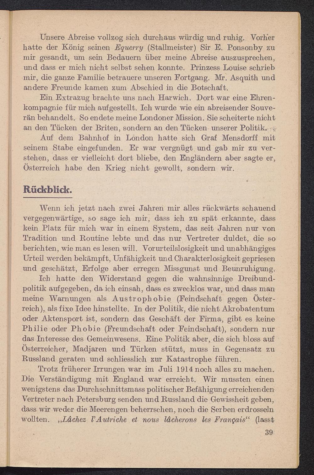 Auf dem Bahnhof in London hatte sich Graf Mensdorff mitseinem Stabe eingefunden. Er war vergnügt und gab mir zu ver-stehen, dass er vielleicht dort bliebe, den Engländern aber sagte er,Österreich habe den Krieg nicht gewollt, sondern wir.
