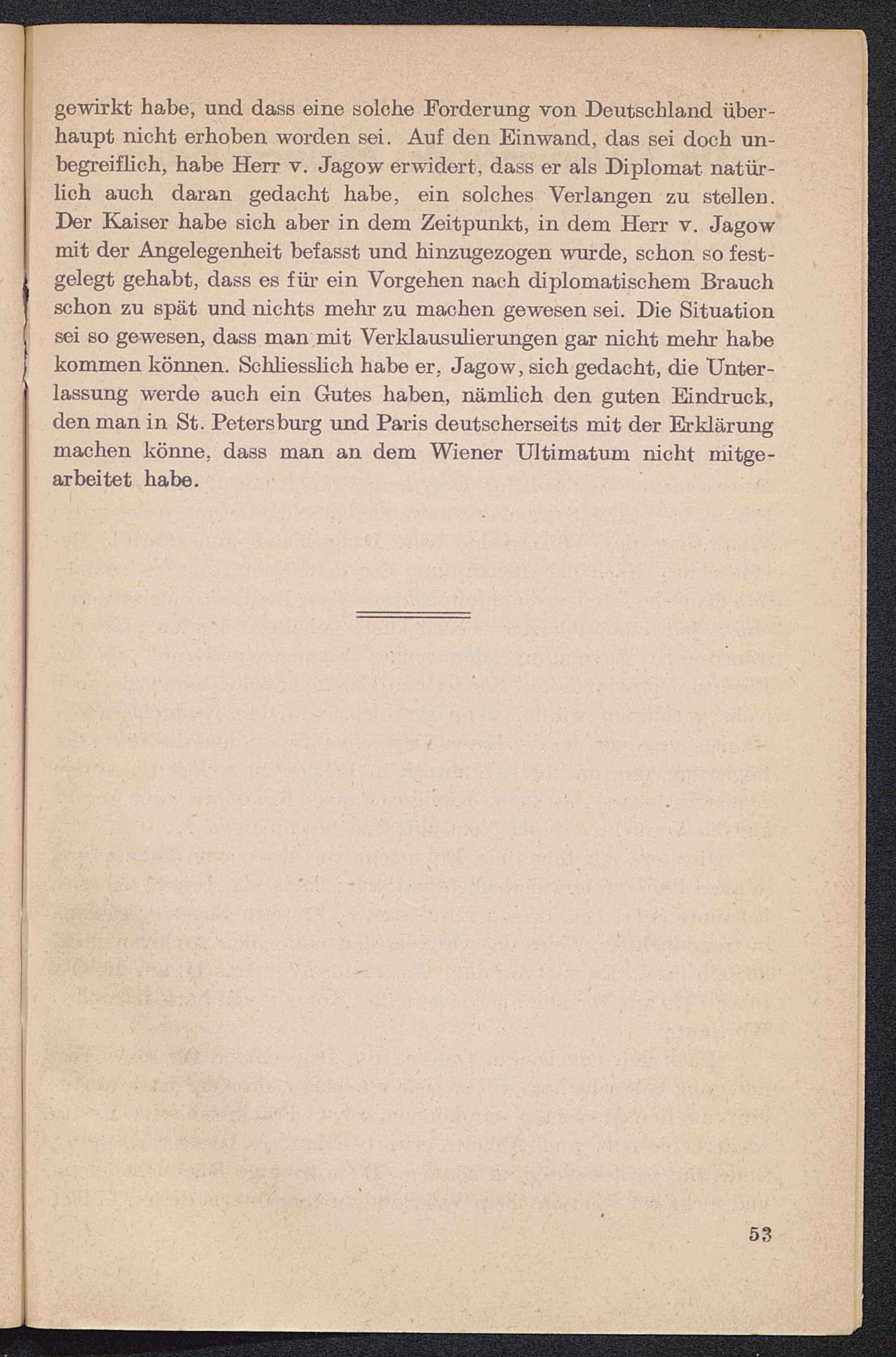 gewirkt habe, und dass eine solche Forderung von Deutschland über-haupt nicht erhoben worden sei. Auf den Einwand, das sei doch un-begreiflich, habe Herr v. Jagow erwidert, dass er als Diplomat natür-lich auch daran gedacht habe, ein solches Verlangen zu stellen.Der Kaiser habe sich aber in dem Zeitpunkt, in dem Herr v. Jagowmit der Angelegenheit befasst und hinzugezogen wurde, schon so fest-gelegt gehabt, dass es für ein Vorgehen nach diplomatischem Brauchschon zu spät und nichts mehr zu machen gewesen sei. Die Situationsei so gewesen, dass man mit Verklausulierungen gar nicht mehr habekommen können. Schliesslich habe er, Jagow, sich gedacht, die Unter-lassung werde auch ein Gutes haben, nämlich den guten Eindruck,den man in St. Petersburg und Paris deutscherseits mit der Erklärungmachen könne, dass man an dem Wiener Ultimatum nicht mitge-arbeitet habe.