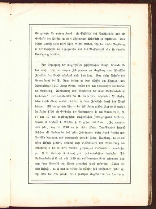 Zur Ergänzung der mitgetheilten geschichtlichen Notizen bemerke ichhier noch, daß im vorigen Jahrhunderte zu Augsburg eine öffentlicheJubelfeier der Buchdruckerkunst nicht statt fand. Nur eiuige Schüler desGymnasiums bei St. Anna hielten in ihren Klassen am Thomas- undJohannistage 1740 „kurze Reden, welche von den vornehmsten Umständender Erfindung, Ausbreitung und Nutzbarkeit der edlen Buchdruckcrkunsthandelten." Der Kollaborator der II. Classe dieser Lehranstalt N. Andr.Christoph Graf machte dieselben in dem Jubeljahr durch den Druckbekannt. Als der gelehrte Pfarrer bei heil. Kreuz dahicr, Jakob Bruckerim Jahre 1730 die Geschichte der Buchdruckerei in den Nummern 8, 9,11 und 12 der augsburgischen wöchentlichen Jntelligcnzzettel beschrieb,äußerte er deßhalb I. Abschn. §. 2. gegen das Ende: „Ich wunderemich sehr, daß da 1740 an so vielen Orten Deutschlandes sowohlGelehrte als Buchdrucker das dritte Jahrhundert dieser Kunst feierlich undschriftlich begangen, und merkwürdig gemacht haben, Augsburg , da es amersten Ursache gehabt, dennoch diese Solennitäten und Erneuerung desGedächtnisses der in ihren Mauern gepflanzten Buchdruckerci unterlassenhat. §. 3. Vielleicht ist es noch Zeit, das unterlassene einzuholen. DieBuchdruckerkunst ist erst mit 1430 zur vollkommenen Reife gekommen undman kann schwerlich ein älteres gedrucktes Buch ausweisen. Haben wirnicht Ursache, da es nun in diesem Jubeljahre just dreihundert Jahre ist,daß man die erste Frucht dieses gnädigen Angedenkens der Vorsehung