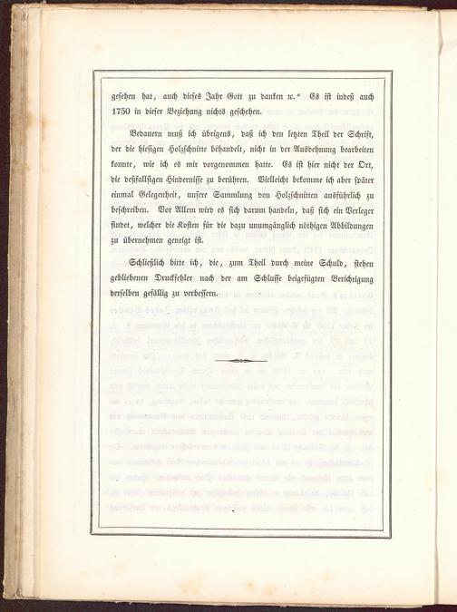Bedauern muß ich übrigens, daß ich den letzten Theil der Schrift,der die hiesigen Holzschnitte behandelt, nicht in der Ausdehnung bearbeitenkonnte, wie ich es mir vorgenommen hatte. Es ist hier nicht der Ort,die deßfallsigen Hindernisse zu berühren. Vielleicht bekomme ich aber spätereinmal Gelegenheit, unsere Sammlung von Holzschnitten ausführlich zubeschreiben. Vor Allem wird es sich darum handeln, daß sich ein Verlegerfindet, welcher die Kosten jür die dazu unumgänglich nöthigen Abbildungenzu übernehmen geneigt ist.