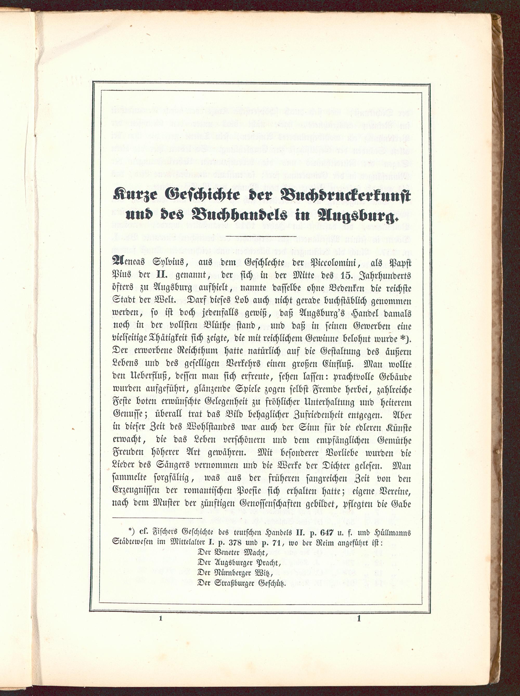 Aeneas Sylvius , aus dem Geschlechte der Pieeolomini, als PapstPlus der II. genannt, der sich in der Mitte des 13. Jahrhundertsöfters zu Augsburg aufhielt, nannte dasselbe ohne Bedenken die reichsteStadt der Welt. Darf dieses Lob auch nicht gerade buchstäblich genommenwerden, so ist doch jedenfalls gewiß, daß Augsburg's Handel damalsnoch in der vollsten Blüthe stand, und daß in seinen Gewerben einevielseitige Thätigkeit sich zeigte, die mit reichlichem Gewinne belohnt wurde ^.Der erworbene Reichthum hatte natürlich auf die Gestaltung des äußernLebens und des geselligen Verkehrs einen großen Einfluß. Man wollteden Ueberfluß, dessen man sich erfreute, sehen lassen: prachtvolle Gebäudewurden aufgeführt, glänzende Spiele zogen selbst Fremde herbei, zahlreicheFeste boten erwünschte Gelegenheit zu fröhlicher Unterhaltung und heiteremGenusse; überall trat das Bild behaglicher Zufriedenheit entgegen. Aberin dieser Zeit des Wohlstandes war auch der Sinn für die edleren Künsteerwacht, die das Leben verschönern und dem empfänglichen GemütheFreuden höherer Art gewähren. Mit besonderer Vorliebe wurden dieLieder des Sängers vernommen und die Werke der Dichter gelesen. Mansammelte sorgfältig, was aus der früheren sangreichen Zeit von denErzeugnissen der romantischen Poesie sich erhalten hatte; eigene Vereine,nach dem Muster der zünftigen Genossenschaften gebildet, pflegten die Gabe