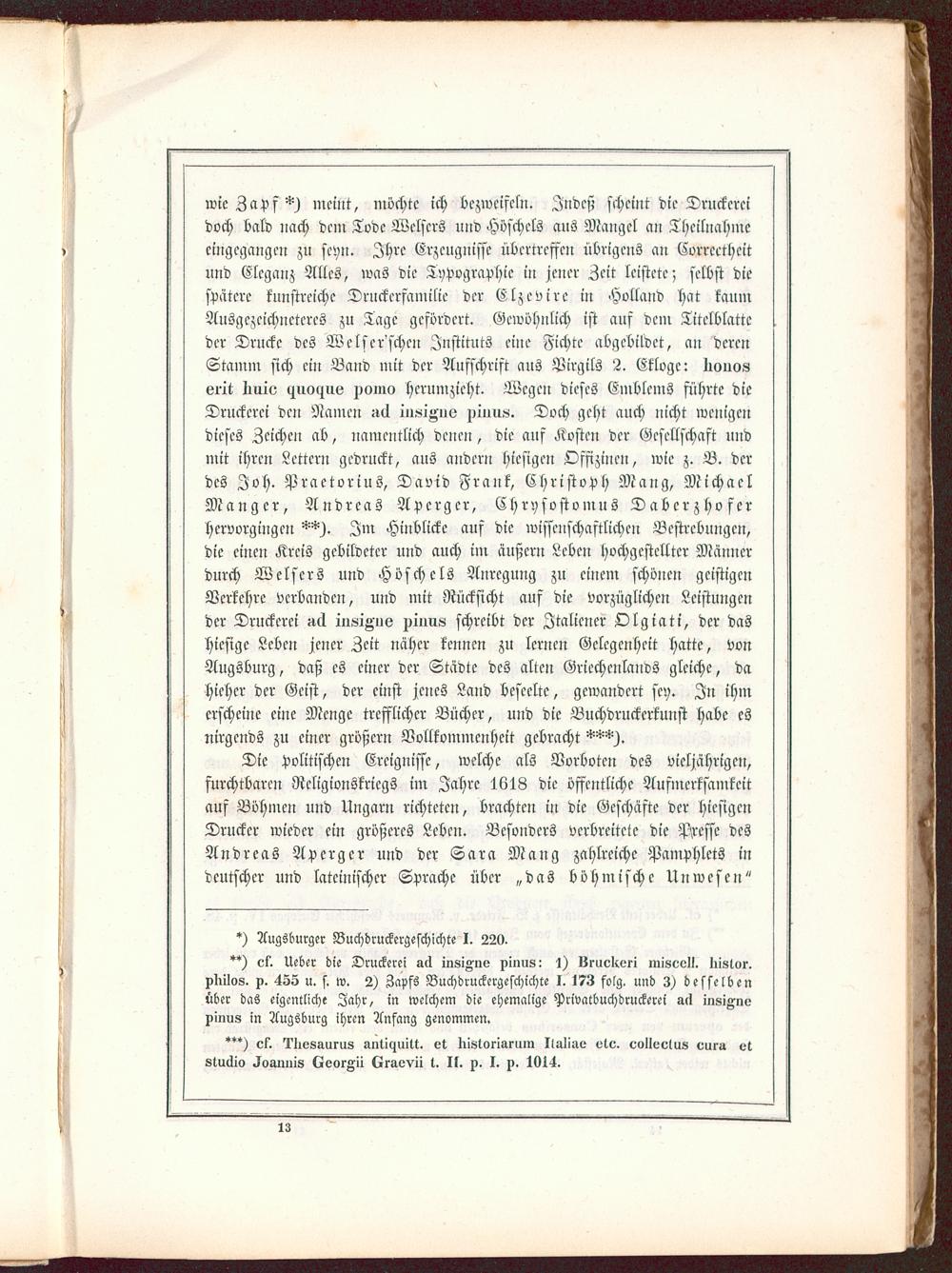 wie Zapf ^) meint, möchte ich bezweifeln. Indeß scheint die Druckereidoch bald nach dein Tode Welscrs und Höschels aus Mangel an Theilnahmeeingegangen zu seyn. Ihre Erzeugnisse übertreffen übrigens an Corrcetheitund Eleganz Alles, was die Typographie in jener Zeit leistete; selbst diespatere kunstreiche Dmckerfamilie der Elzevire in Holland hat kaumAusgezeichneteres zu Tage gefordert. Gewohnlich ist auf dem Titelblatteder Drucke des Welser'schcn Instituts eine Fichte abgebildet, an derenStamm sich ein Band mit der Aufschrift aus Virgils 2. Ekloge: Iimios61-it Iiuio l^uo^ue poino herumzieht. Wegen dieses Emblems führte dieDruckerei den Namen ad iu-ütKus piun«. Doch geht auch nicht wenigendieses Zeichen ab, namentlich denen, die auf Kosten der Gesellschaft undmit ihren Lettern gedruckt, aus andern hiesigen Offizinen, wie z. B. derdes Job. Praetorius, David Frank, Christoph Mang, MichaelMangcr, Andreas Aperger , Chrysostomus Daberzhoferhervorgingen Im Hinblicke auf die wissenschaftlichen Bestrebungen,die einen Kreis gebildeter und auch im äußern Leben hochgestellter Männerdurch Welsers und Höschels Anregung zu einem schönen geistigenVerkehre verbanden, und mit Rücksicht auf die vorzüglichen Leistungender Druckerei ^cl iu«iKus piuus schreibt der Italiener Olgiati, der dashiesige Leben jener Zeit näher kennen zu lernen Gelegenheit hatte, vonAugsburg, daß es einer der Städte des alten Griechenlands gleiche, daHieher der Geist, der einst jenes Land beseelte, gewandert sey. In ihmerscheine eine Menge trefflicher Bücher, und die Buchdruckcrkunst habe esnirgends zu einer größern Vollkommenheit gebracht