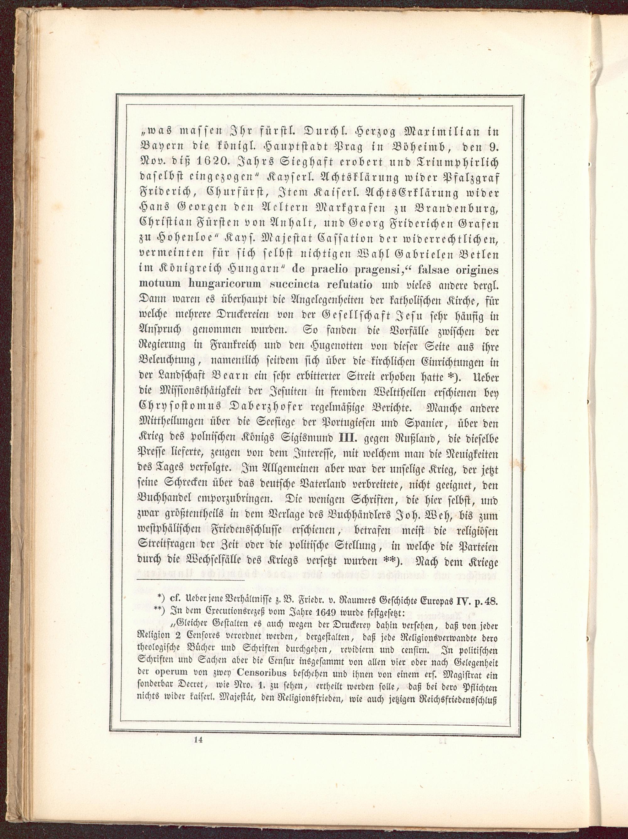 „was Massen Ihr fürstl. Durch!. Herzog Maximilian inBayern die konigl. Hauptstadt Prag in Böheimb, den 9.Nov. diß 1620. Jahrs Sieghaft erobert und Triumphirlichdaselbst eingezogen" Kayscrl. Achtsklärung wider PfalzgrafFridcrich, Churfürst , Item Kaiserl. AchtsErklärung widerHans Georgen den Aeltern Markgrafen zu Brandenburg,Christiau Fürsten von Anhalt, und Georg Friderichcn Grafenzu Hohenloe" Kays. Majestät Kassation der widerrechtlichen,vermeinten für sich selbst nichtigen Wahl Gabrielen Betlenim Königreich H Ungarn" <ie pi^elio prilA6u«i/^ t^Is^s oiiKiueslliotuum IiuilK-^rieoruin sueeiuotü. relVit^tio und vieles audere dcrgl.Dann waren es überhaupt die Angelegenheiten der katholischen Kirche , fürwelche mehrere Druckereien von der Gesellschaft Jesu sehr häufig inAnspruch genommen wurden. So fanden die Vorfälle zwischen derRegierung in Frankreich und den Hugenotten von dieser Seite aus ihreBeleuchtung, uamentlich seitdem sich über die kirchlichen Einrichtungen inder Landschaft Bearn ein sehr erbitterter Streit erhoben hatte Ueberdie Missionsthätigkcit der Jesuiten in fremden Welttheilen erschienen beyChrusostomus Dabcrzhofer regelmäßige Berichte. Manche andereMittheilungen über die Secsiegc der Portugiesen und Spanier, über denKrieg des polnischen Königs Sigismund III. gegen Rußland , die dieselbePresse lieferte, zeugen von dem Interesse, mit welchem man die Neuigkeitendes Tages verfolgte. Im Allgemeinen aber war der unselige Krieg, der jetztseine Schrecken über das deutsche Vaterland verbreitete, nicht geeignet, denBuchhandel cmporzubringen. Die wenigen Schriften, die hier selbst, undzwar größtentheits in dem Verlage des Buchhändlers Joh. Weh, bis zumwcstphälischen Friedensschlüsse erschienen, betrafen meist die religiösenStreitfragen der Zeit oder die politische Stellung, in welche die Parteiendurch die Wechselfälle des Kriegs versetzt wurden Nach dem Kriege