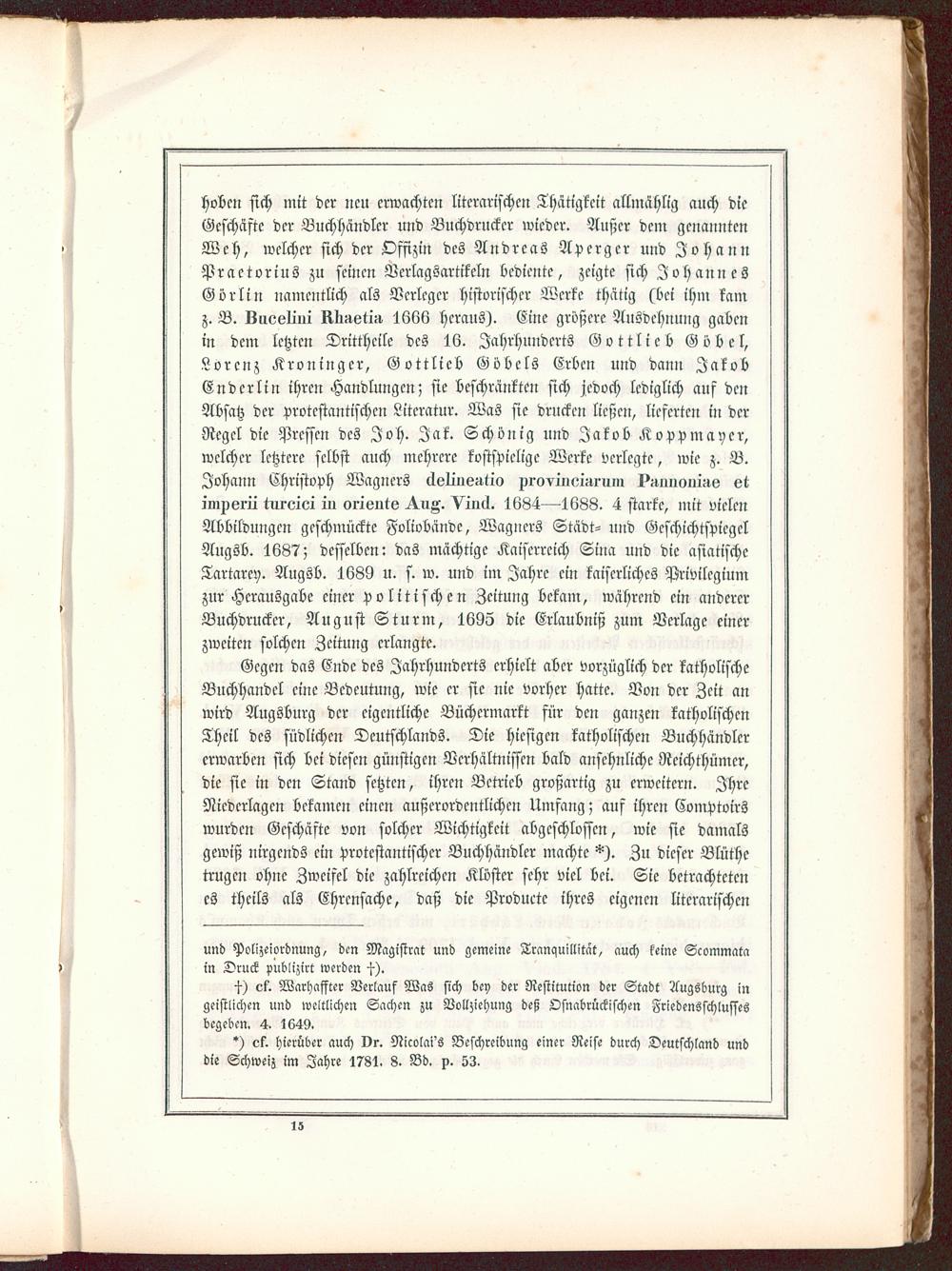 hoben sich mit der neu erwachten literarischen Thätigkeit allmählig auch dieGeschäfte der Buchhändler und Buchdrucker wieder. Außer dem genanntenWeh, welcher sich der Offizin des Andreas Aperger und JohannPraetorius zu seinen Verlagsartikeln bediente, zeigte sich JohannesGörlin namentlich als Verleger historischer Werke thätig (bei ihm kamz. B. Lueeliui Miwtiu, 1666 heraus). Eine größere Allsdehnung gabenin dem letzten Drittheile des 16. Jahrhunderts Gottlieb Göbel,Lorenz Kroninger, Gottlieb Göbels Erben und dann JakobEnd erlin ihren Handlungen; sie beschränkten sich jedoch lediglich auf denAbsatz der protestantischen Literatur. Was sie drucken ließen, lieferten in derRegel die Pressen des Joh. Jak. Schönig und Jakob Koppmayer,welcher letztere selbst auch mehrere kostspielige Werke verlegte, wie z. B.Johann Christoph Wagners clelllie^tio pi-ovinoicu-um pmiiioui^s etimjiki-ii tuioiei iu orleuts ^.UK. Vinä. 1684—4688. 4 starke, mit vielenAbbildungen geschmückte Foliobände, Wagners Städt- und GeschichtspiegelAugsb . 1687; desselben: das mächtige Kaiserreich Sina und die asiatischeTartarey. Augsb. 1689 u. s. w. und im Jahre ein kaiserliches Privilegiumzur Herausgabe einer politischen Zeitung bekam, während ein andererBuchdrucker, August Sturm, 1695 die Erlaubniß zum Verlage einerzweiten solchen Zeitung erlangte.