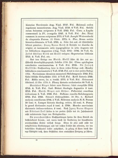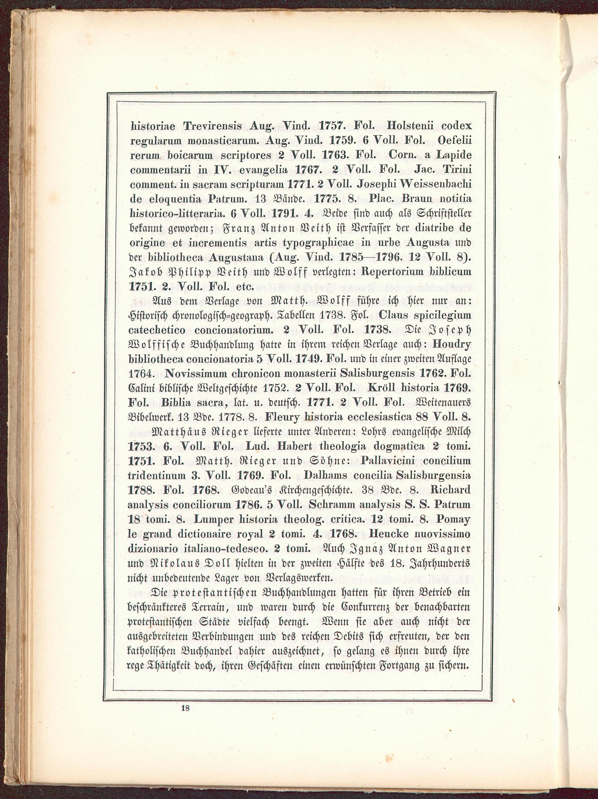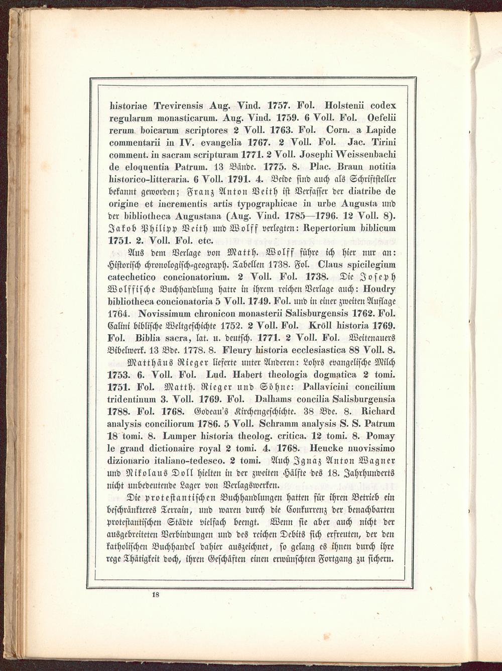 Matthäus Rieger lieferte unter Anderen: Lohrs evangelische Milch1753. 6. Voll. U'ol. I^uä. Kellert tliooloKi^ äoKMÄtieit 2 tomi.1751. Ü'ol. Matth. Rieger und Söhne: ?cäln.vieini eonoiliumtriäeutiuum 3. Voll. 1769. k'ol. Oiälmms eoneiliii 8^li8liurK6n«iii1788. l^ol. 1768. Godeau's Kirchengeschichte. 38 Bde. 8. Kielmräauitl^si« ooneiliorum 1786. 5 Voll. 8eliriunm iui-tl^si« 8. 8. ?iitrum18 tomi. 8. I^mmpor liistori-t tlieoloK. oritie^. 12 tomi. 8. ?om-t^ls Kimtä äierionlure ro^l 2 tomi. 1. 1768. Leuvlco uuovissimoäisioimrio iwlimio-toäeseo. 2 tomi. Auch Jgnaz Anton Wagnerund Nikolaus Doll hielten in der zweiten Hälfte des 18. Jahrhundertsnicht unbedeutende Lager von Verlagswerken.