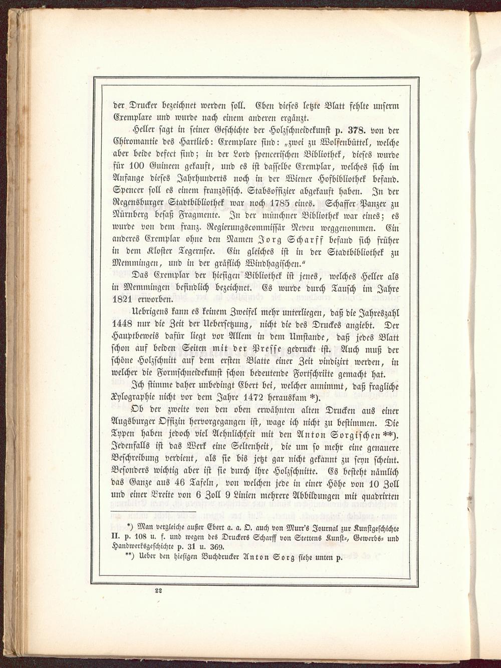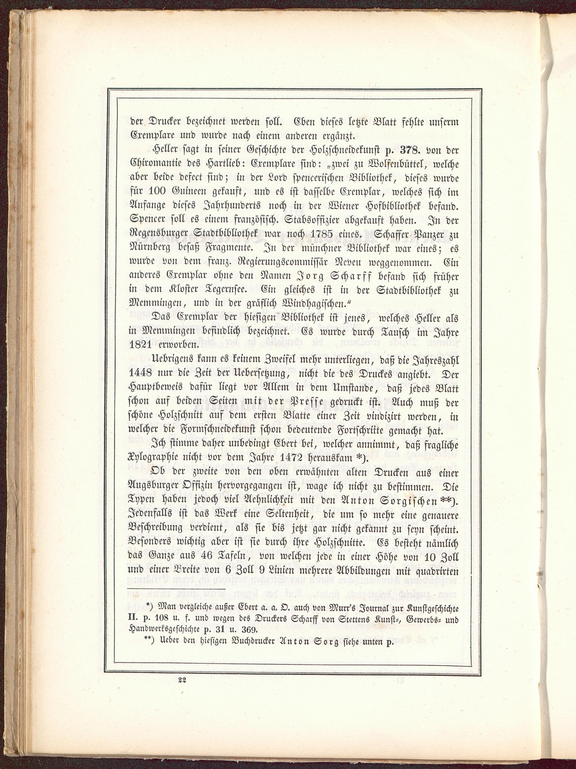 *) Man vergleiche außer Ebert a. a. O. auch von Murr's Journal zur KunstgeschichteII. p. 108 u. f. und wegen des Druckers Scharff von Stettens Kunst-, Gewerbs- undHandwerksgeschichre p. 31 u. 369.
